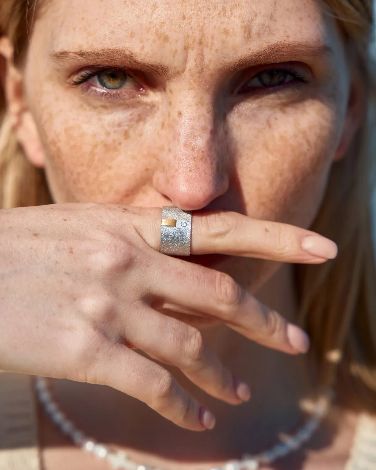 Quasar — лаконичное кольцо с акцентом. Матовое серебро, гладкий золотой элемент и камень образуют чёткую композицию, в которой всё сбалансировано. Простая форма с динамикой — как световой импульс в центре спокойствия. Коллекция Space — это украшения, вдохновлённые космосом: его фактурой, его порядком и хаосом одновременно.
