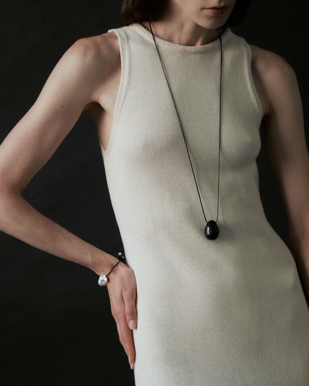 На хлопковом шнурке закреплены две жемчужины на концах.