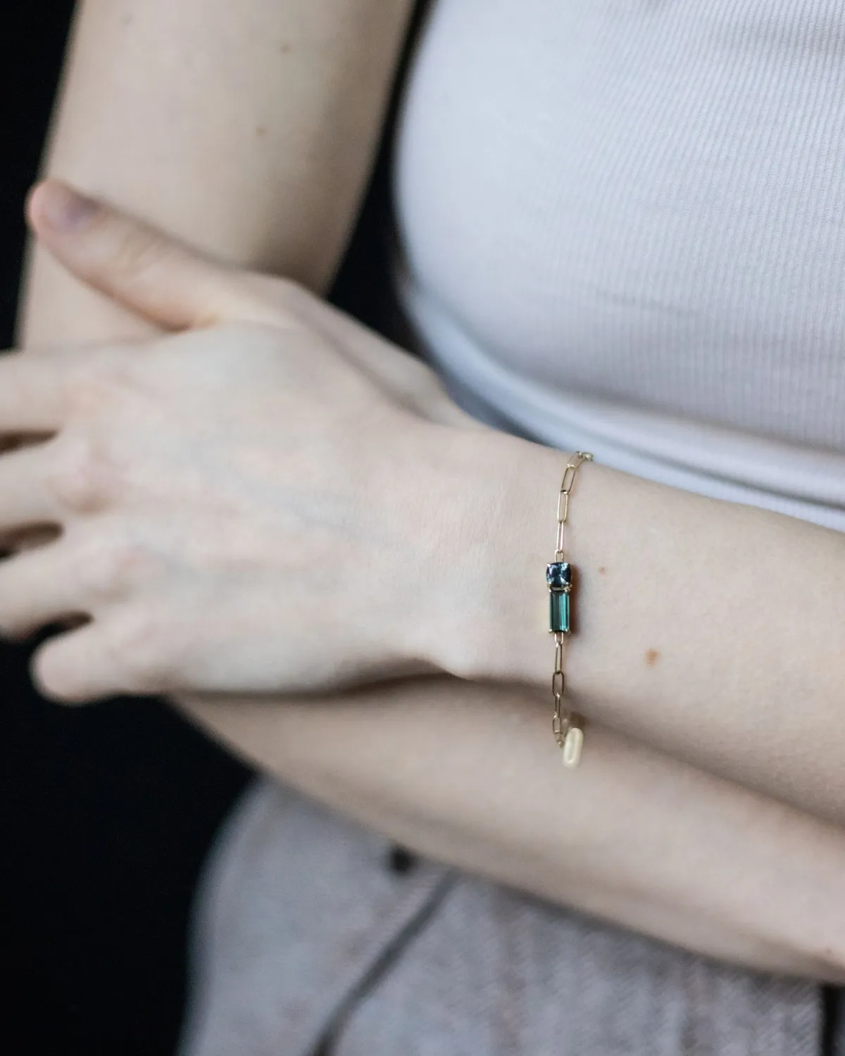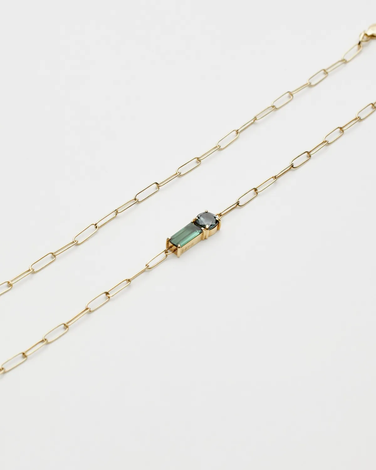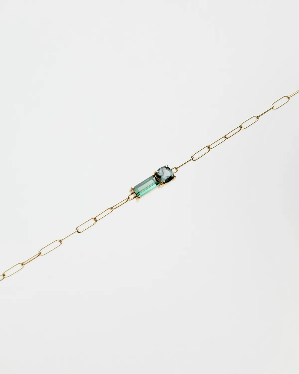 Браслет-цепь со шпинелью глубокого грозового оттенка и турмалином багетной огранки. Изготовлен и собран вручную из золота лимонного оттенка.