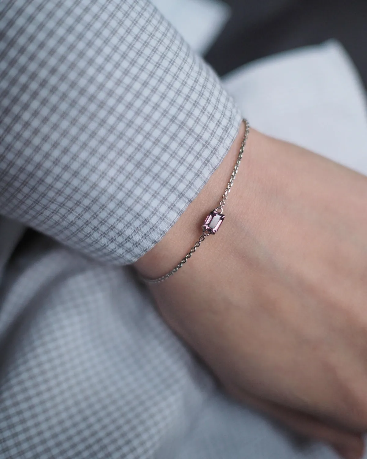 Лаконичный, изящный браслет со шпинелью, подчёркнутой белым золотом. Рекомендуем сочетать с другими оттенками шпинели на браслетах серии, а также дополнять сеты из колец бренда. Браслет может быть выполнен под заказ с нужным оттенком или огранкой шпинели.