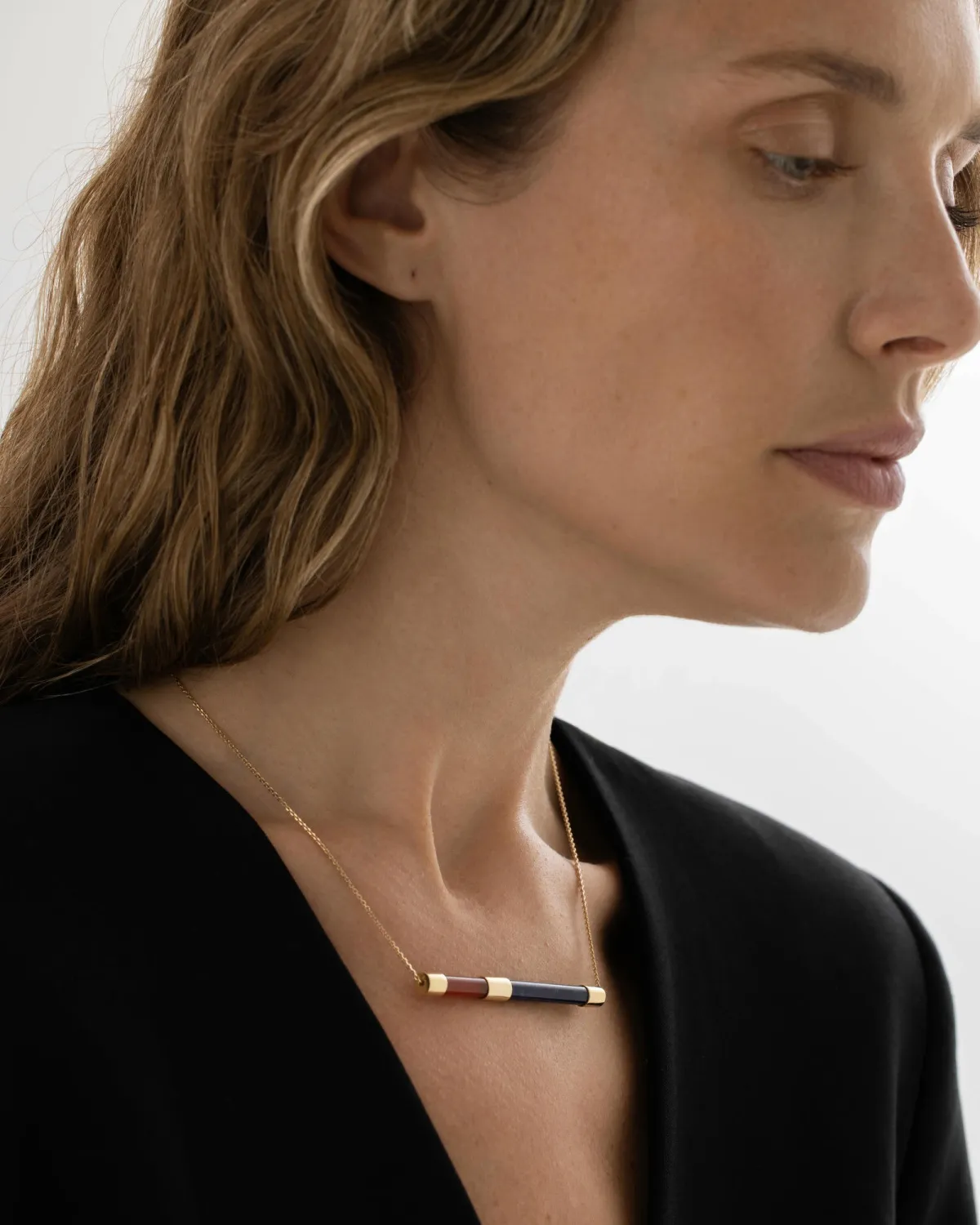 Строгое, но заметное колье в форме прямой линии – одного из основных элементов в живописи супрематизма, графичного символа движения и динамики.