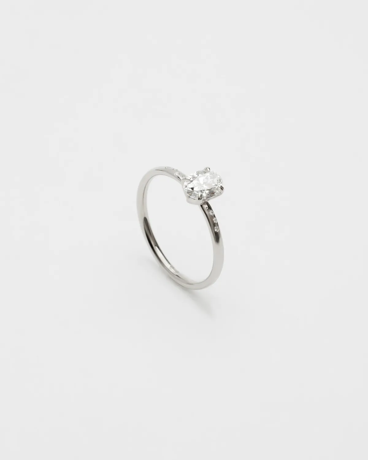Изящное кольцо ручной работы из белого золота с бриллиантом. Россыпь бриллиантов на шинке дополнительно подсвечивает металл и центральный камень. Лаконичный варинат для помолвки или других радостных поводов. Кольцо создано вручную в единственном экземпляре.