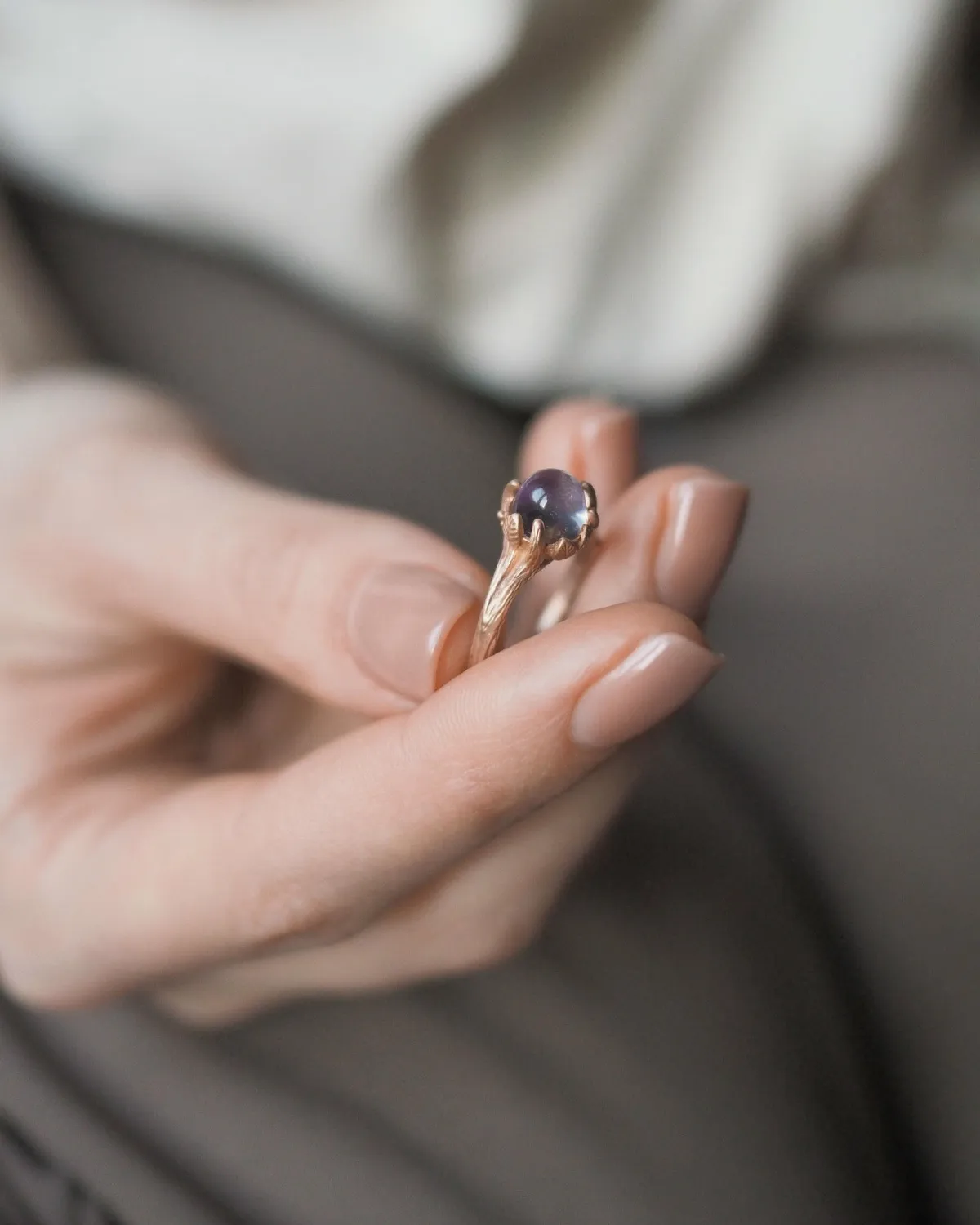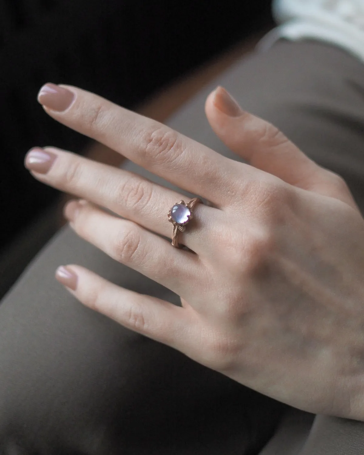 Кольцо в виде изящной веточки с листьями, которые держат камень.
