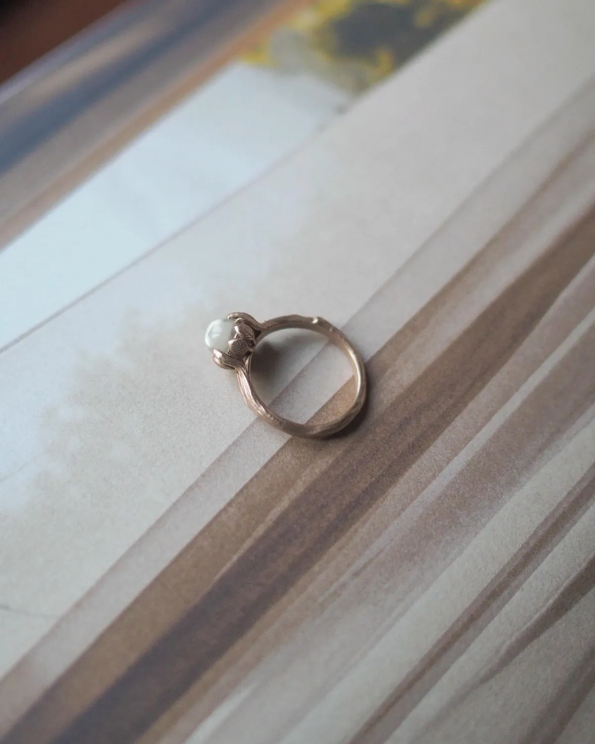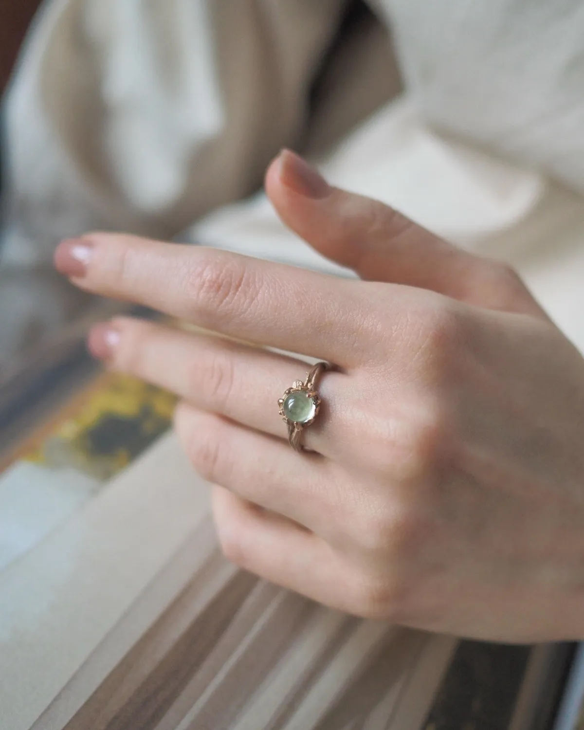 Кольцо в виде изящной веточки с листьями, которые держат камень.