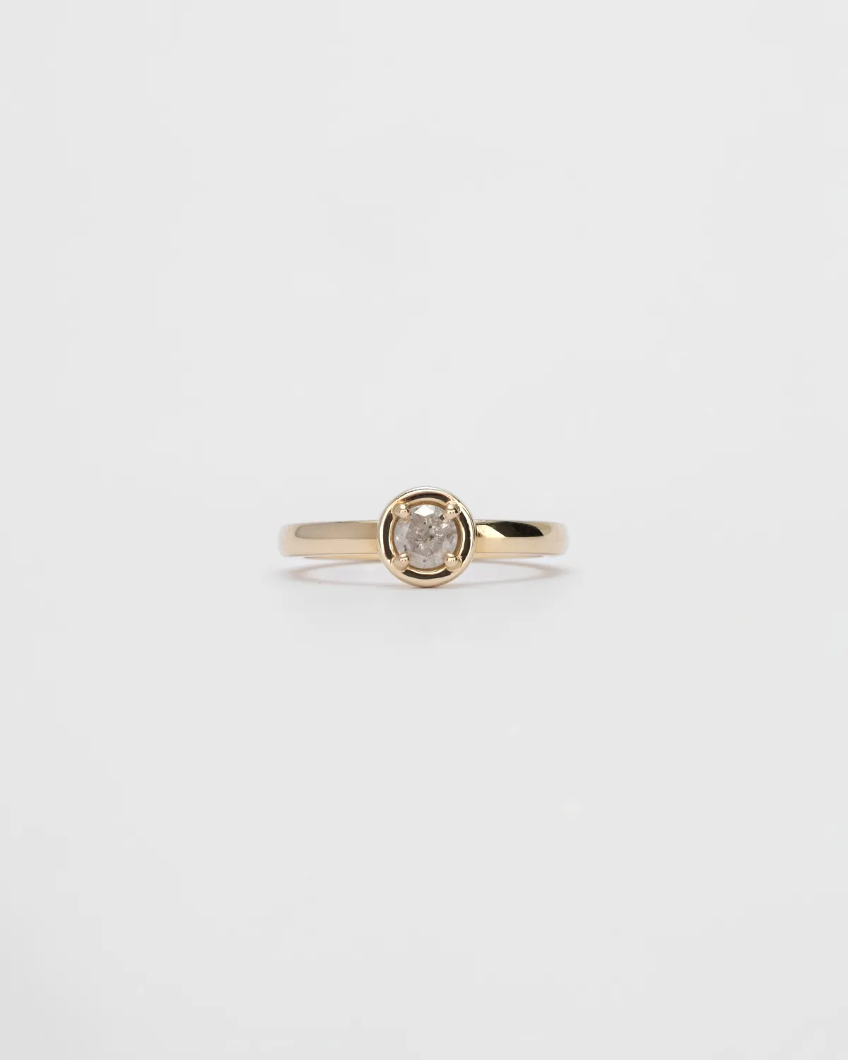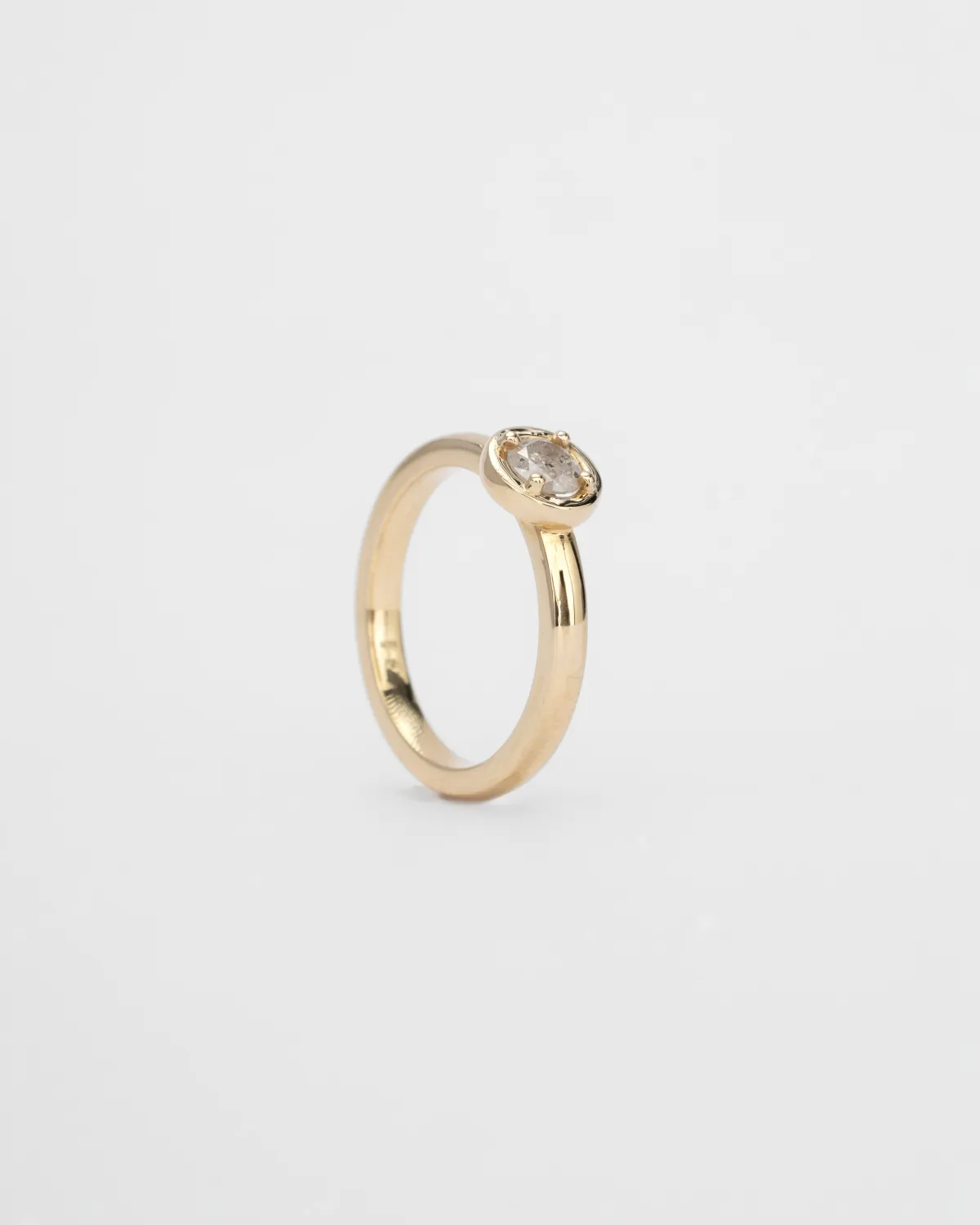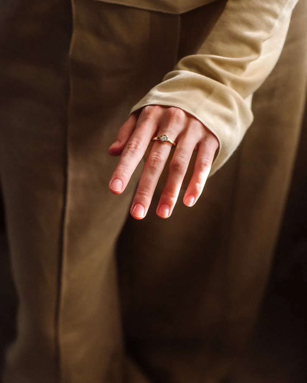 Кольцо, изготовленное вручную для MORE в единственном экзепляре. Бриллиант "Соль и перец" имеет видимые внутренние включения, которые создают уникальный, «млечный» узор из черных и белых фрагментов, напоминающий космос. Камень закреплён в надёжный каст из лимонного золота, который очень комфортен в носке рядом с другим кольцом.