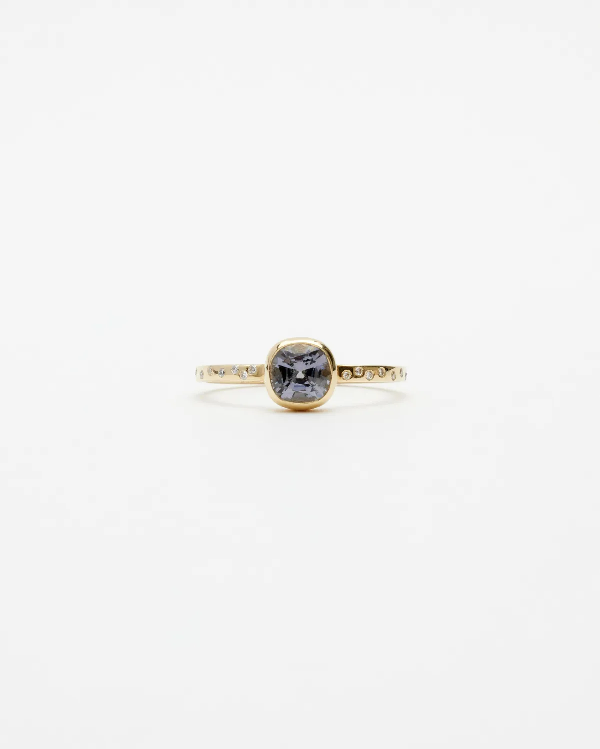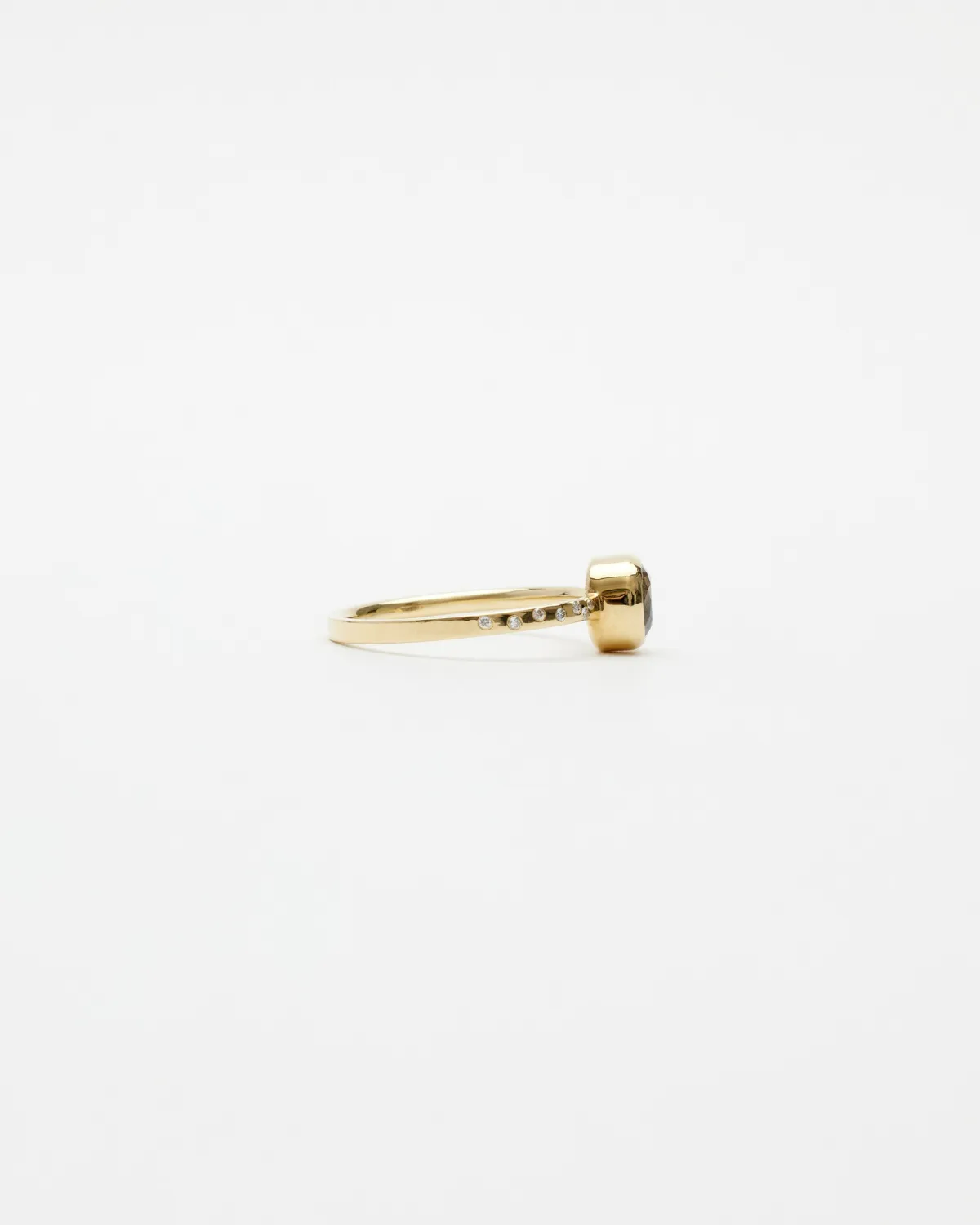 Изящное кольцо из лимонного золота со шпинелью огранки кушон и россыпью бриллиантов по шиинке. Создано вручную в единственном экземпляре.
