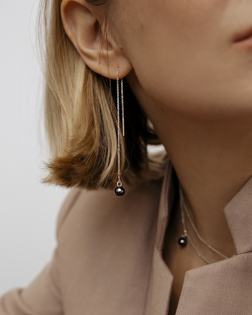 Изящные базовые цепочки-протяжки длиной 12 см с жемчужинами разного цвета 6 мм. Если в одном ушке у вас несколько проколов, цепочку можно протянуть и в них тоже для создания нежной ассиметричной посадки.