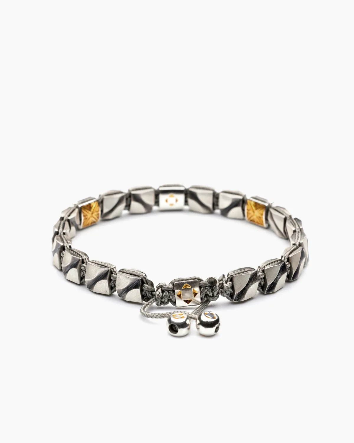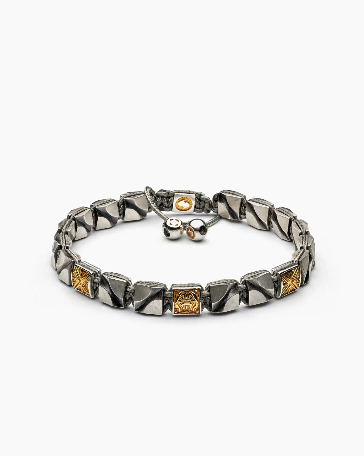 Серебряные элементы выполнены из полновесного серебра 925 пробы и сплетены прочным кордовым шнуром, образуя строгий ритм. В композицию вплетены два символичных элемента солнца и мотылька, создающие целостную историю о свободе, обновлении и вечном движении вперёд.