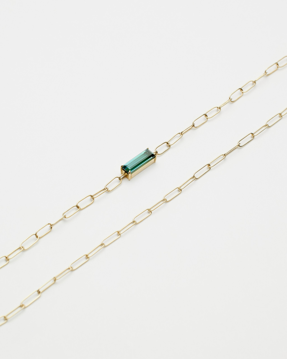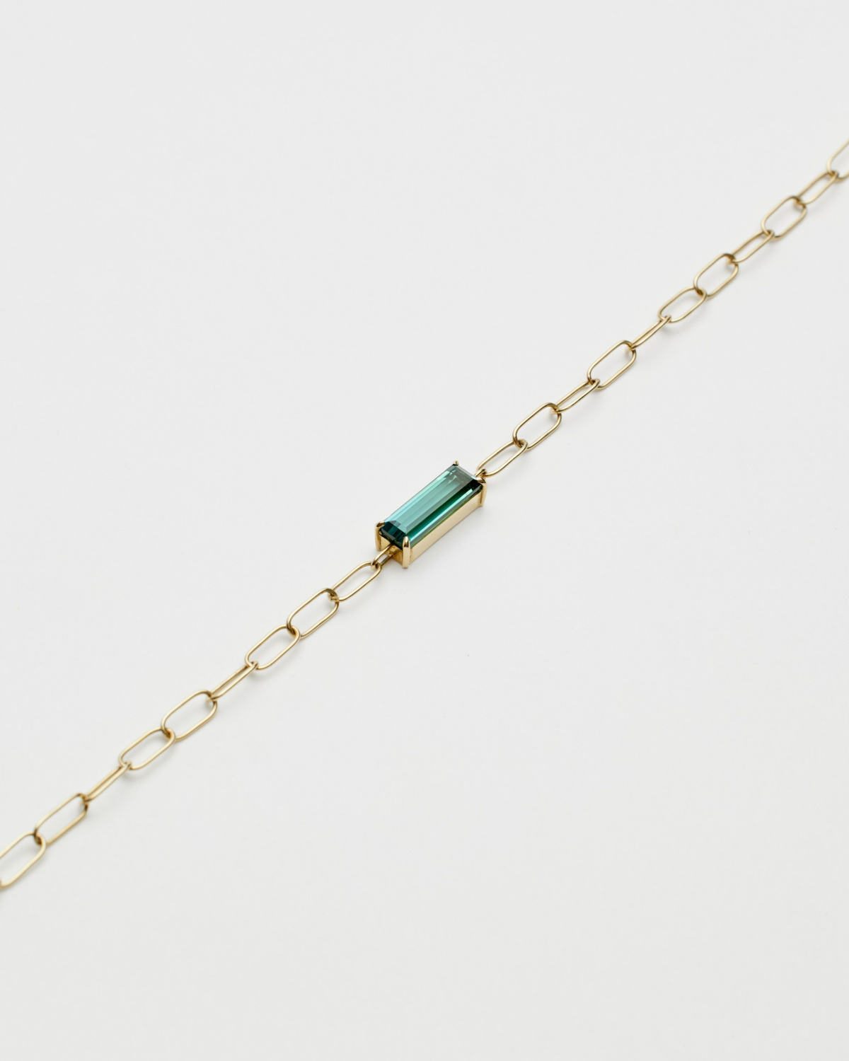 Браслет-цепь с турмалином багетной огранки. Изготовлен и собран вручную из золота лимонного оттенка.