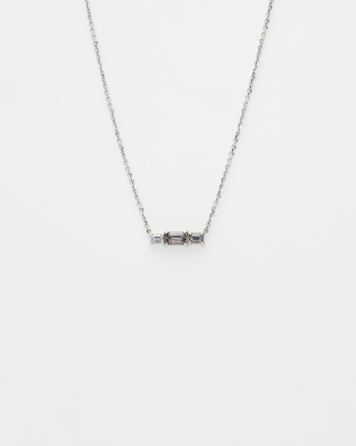 Колье из белого золота с тремя дымчатыми шпинелями. Длина цепочки регулируется, максимальная — 47 см.