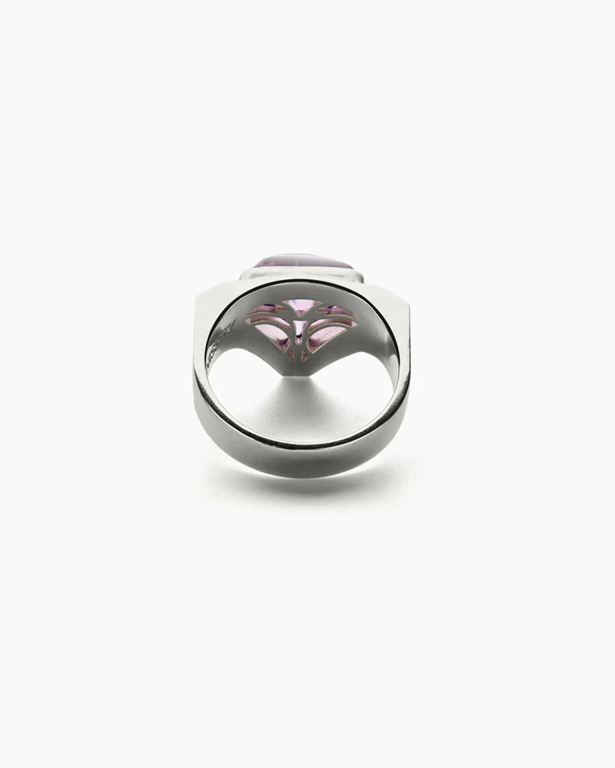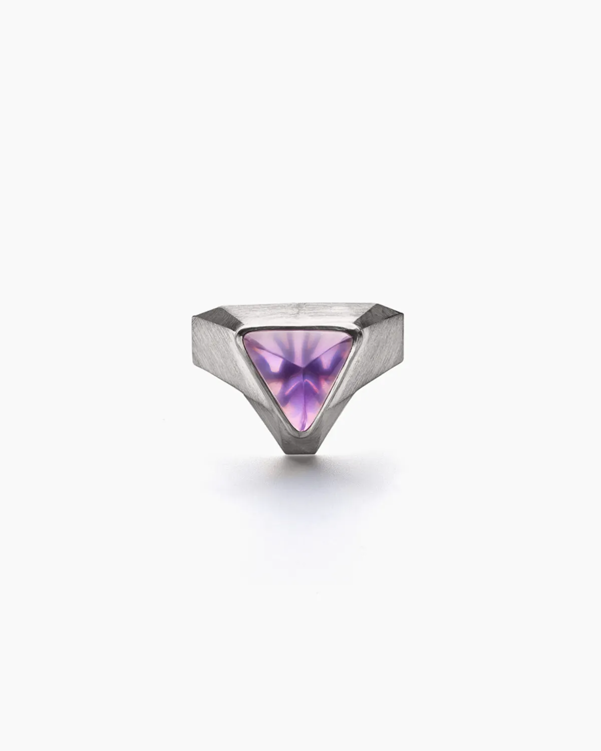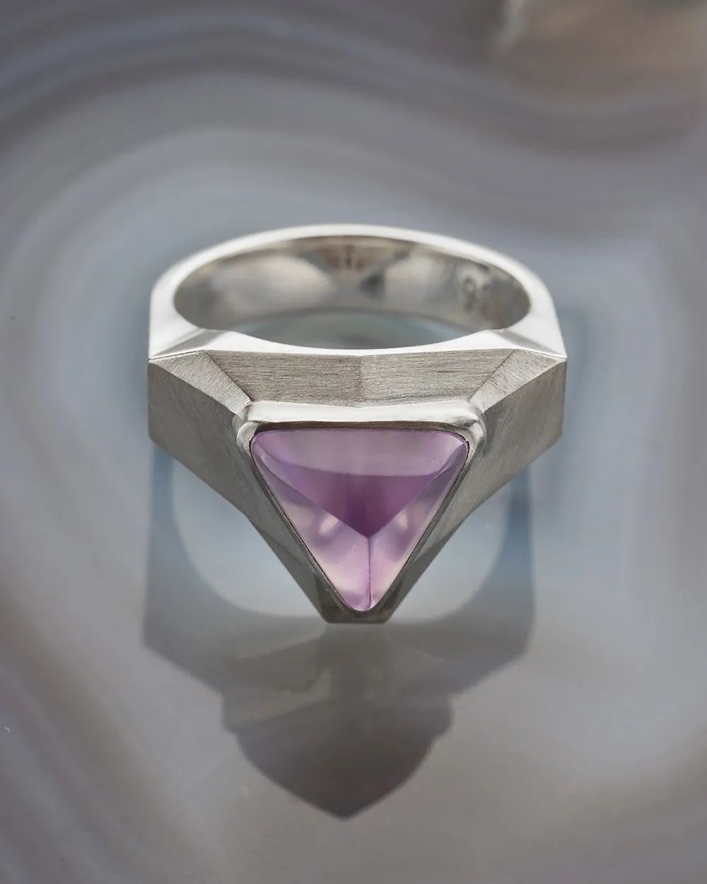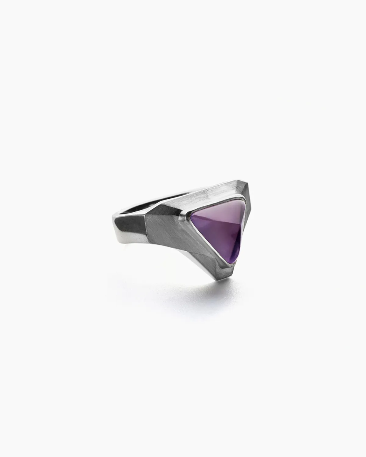 Вставка вырезана вручную из аметиста, камень закреплен в геометричной оправе, напоминающей древние боевые артефакты.