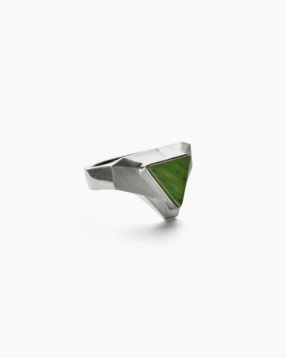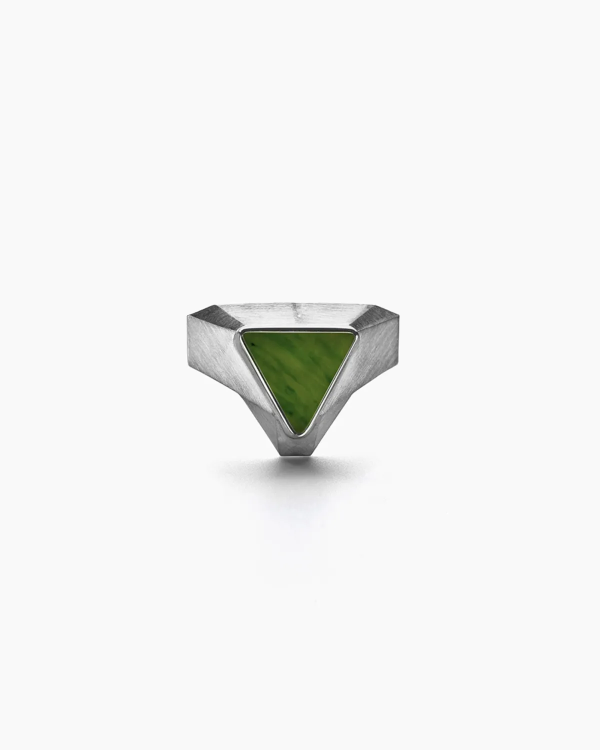 Вставка вырезана вручную из нефрита, камень закреплен в геометричной оправе, напоминающей древние боевые артефакты.