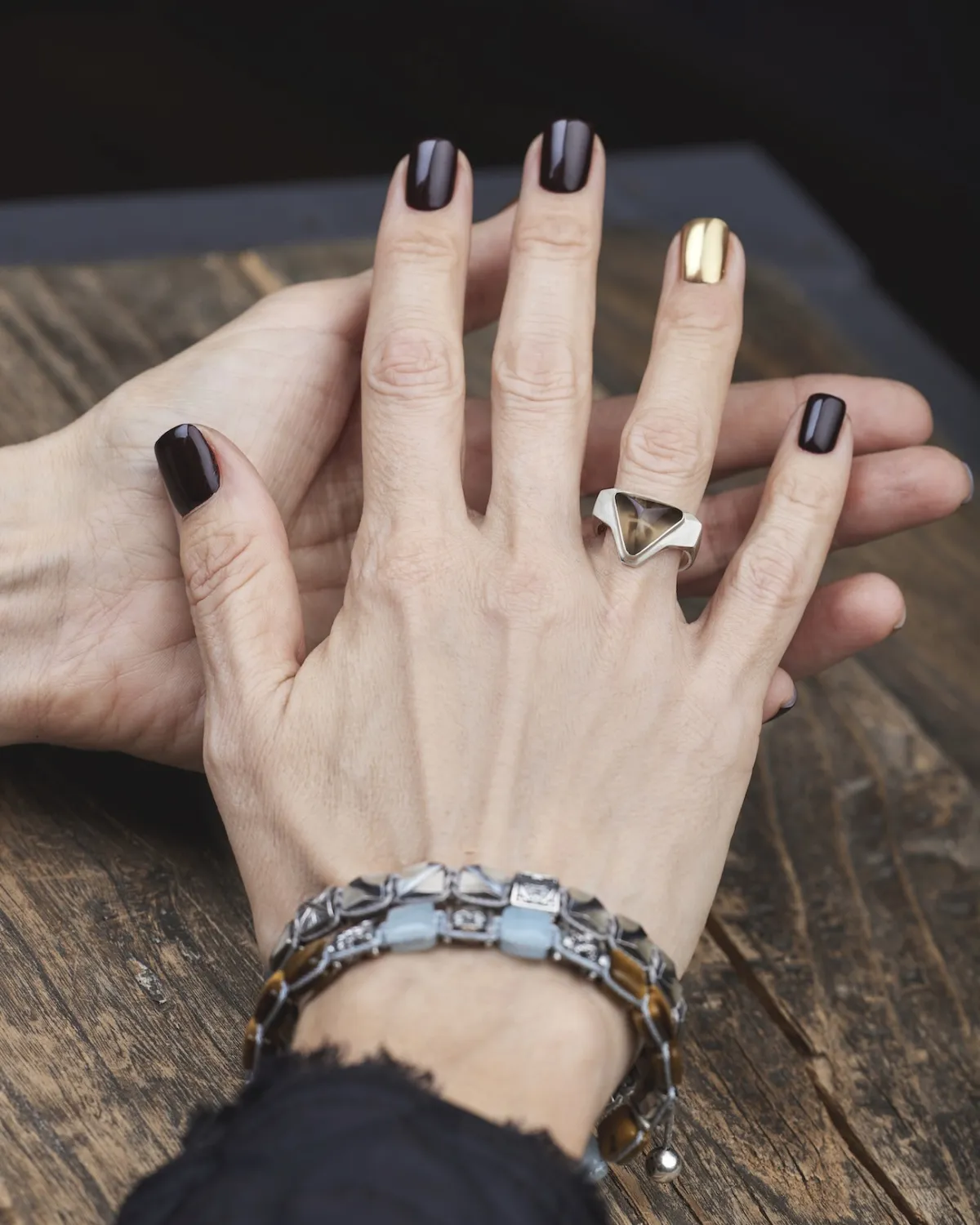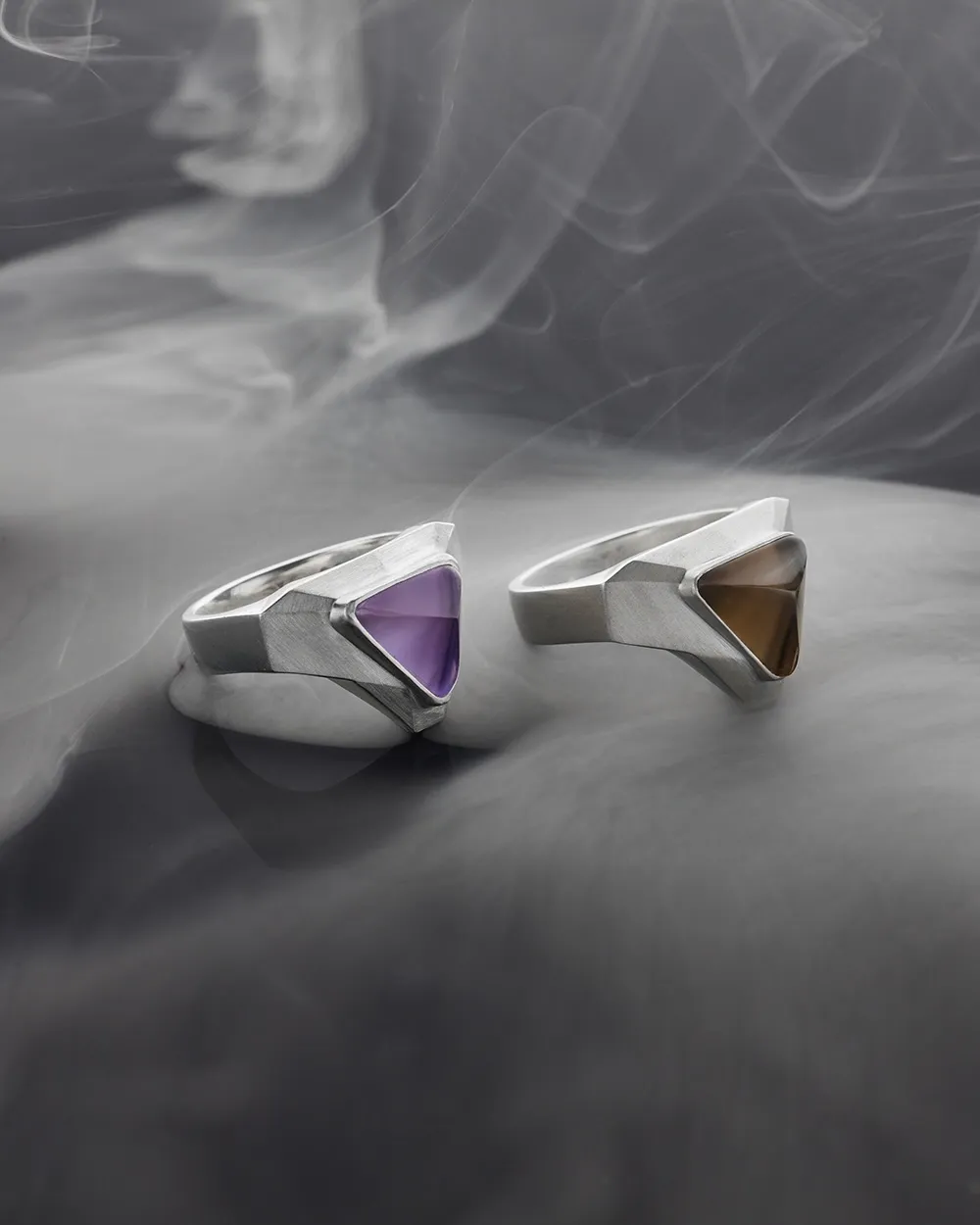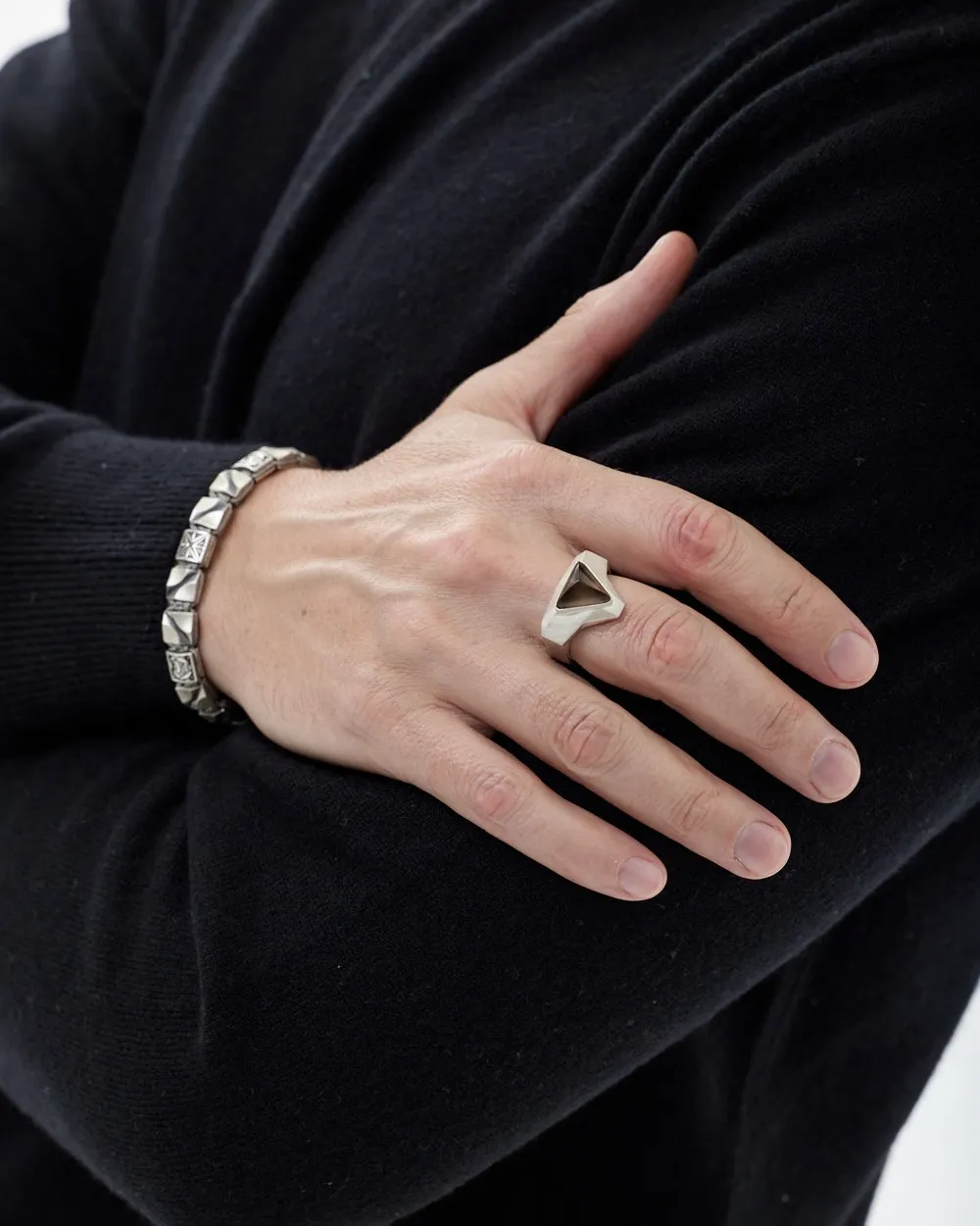 Вставка вырезана вручную из дымчатого кварца или раухтопаза, камень закреплен в геометричной оправе, напоминающей древние боевые артефакты.