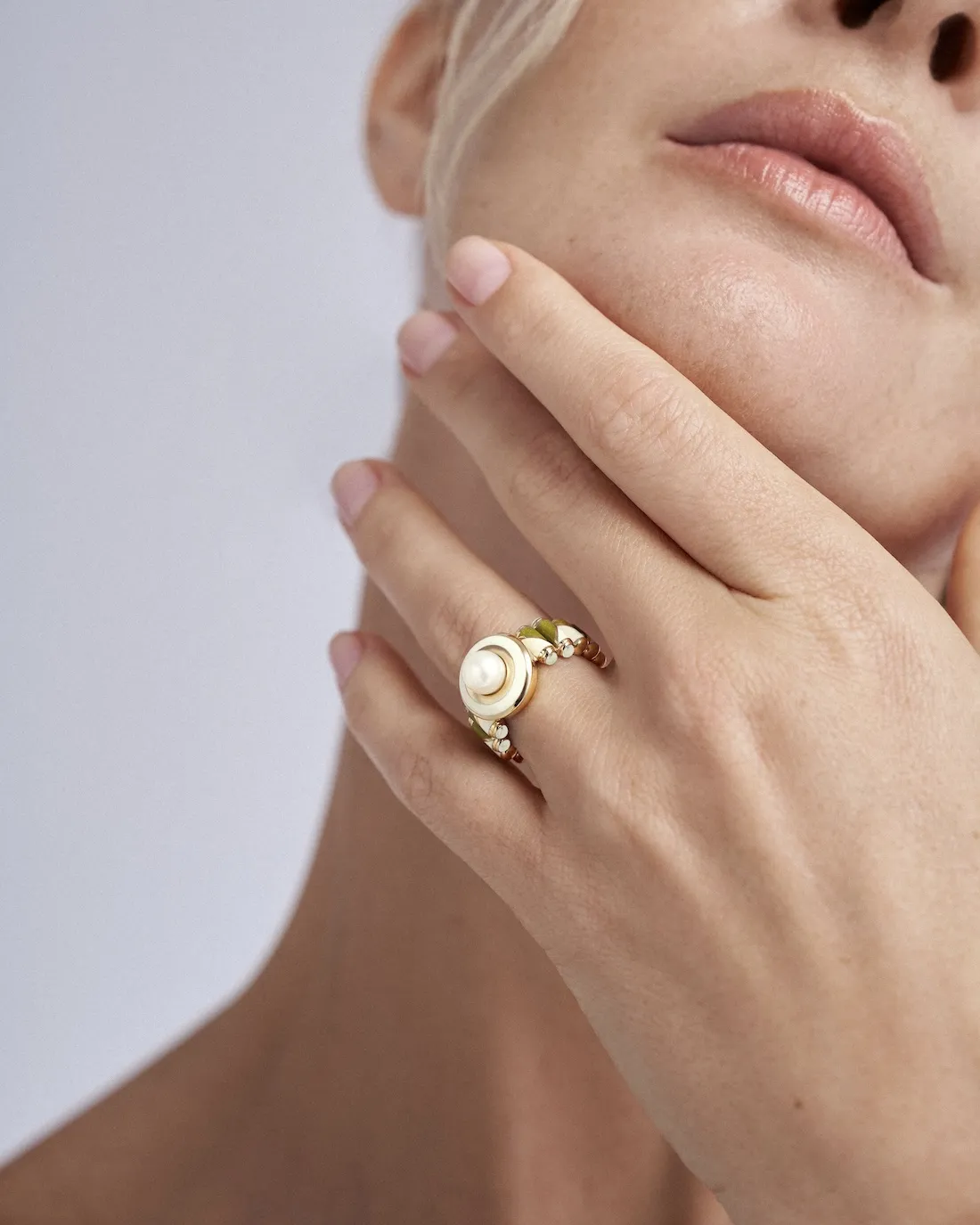 Акцентное кольцо ручной работы с жемчужиной и объёмными складками металла в горячей эмали. По торцу кольца расположено 8 магнезитовых кабошонов, подчёркивающих перламутр и рисунок на шинке.