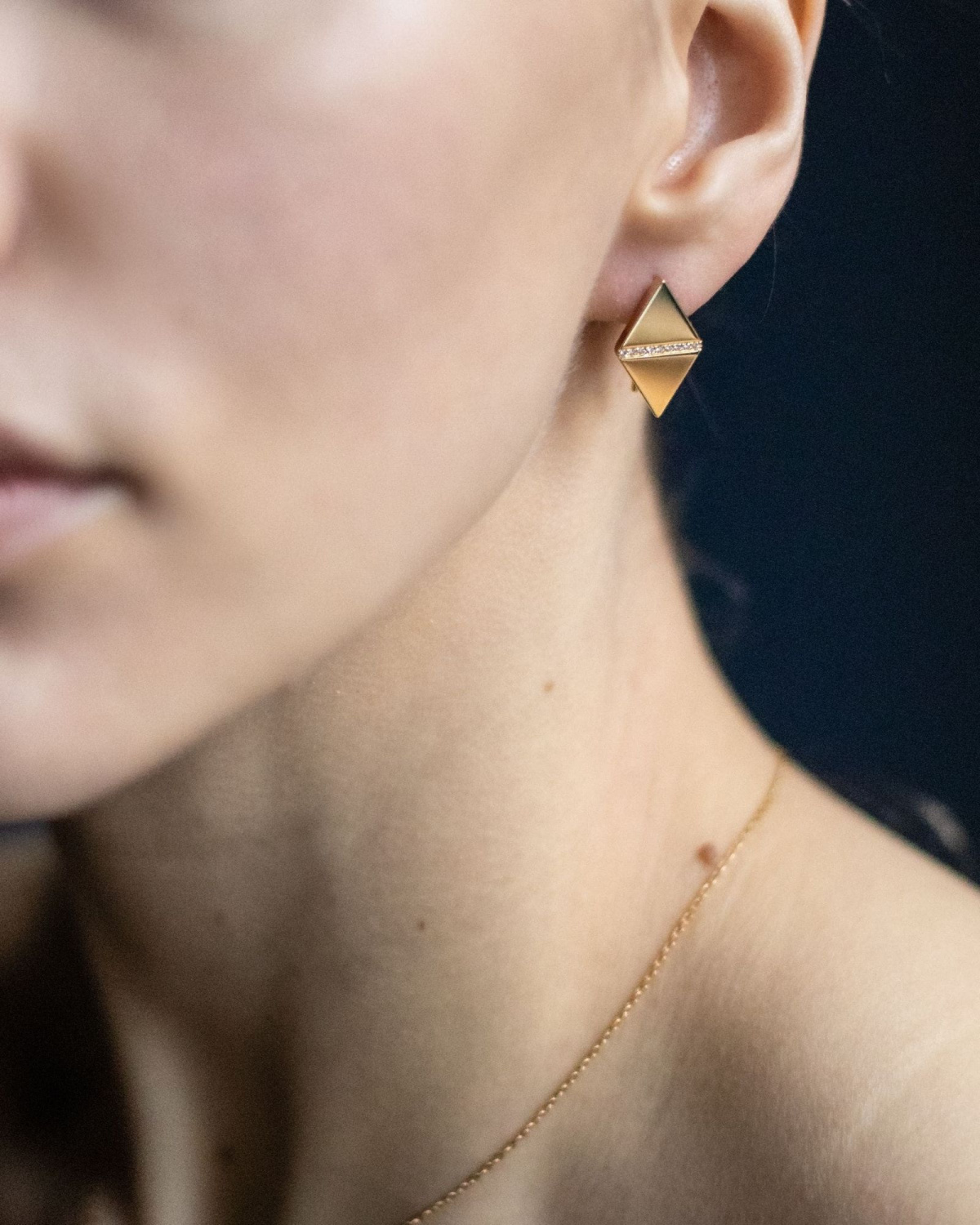 Два треугольника соединяются дорожкой из бриллиантов, графично повторяя форму скарабея. Скарабей был символом солнечного божества Ра и одним из самых популярных украшений в Древнем Египте. Амулеты часто находили внутри Великих пирамид, поскольку считалось, что они символизируют воскрешение, обновление, возрождение, защиту и удачу.