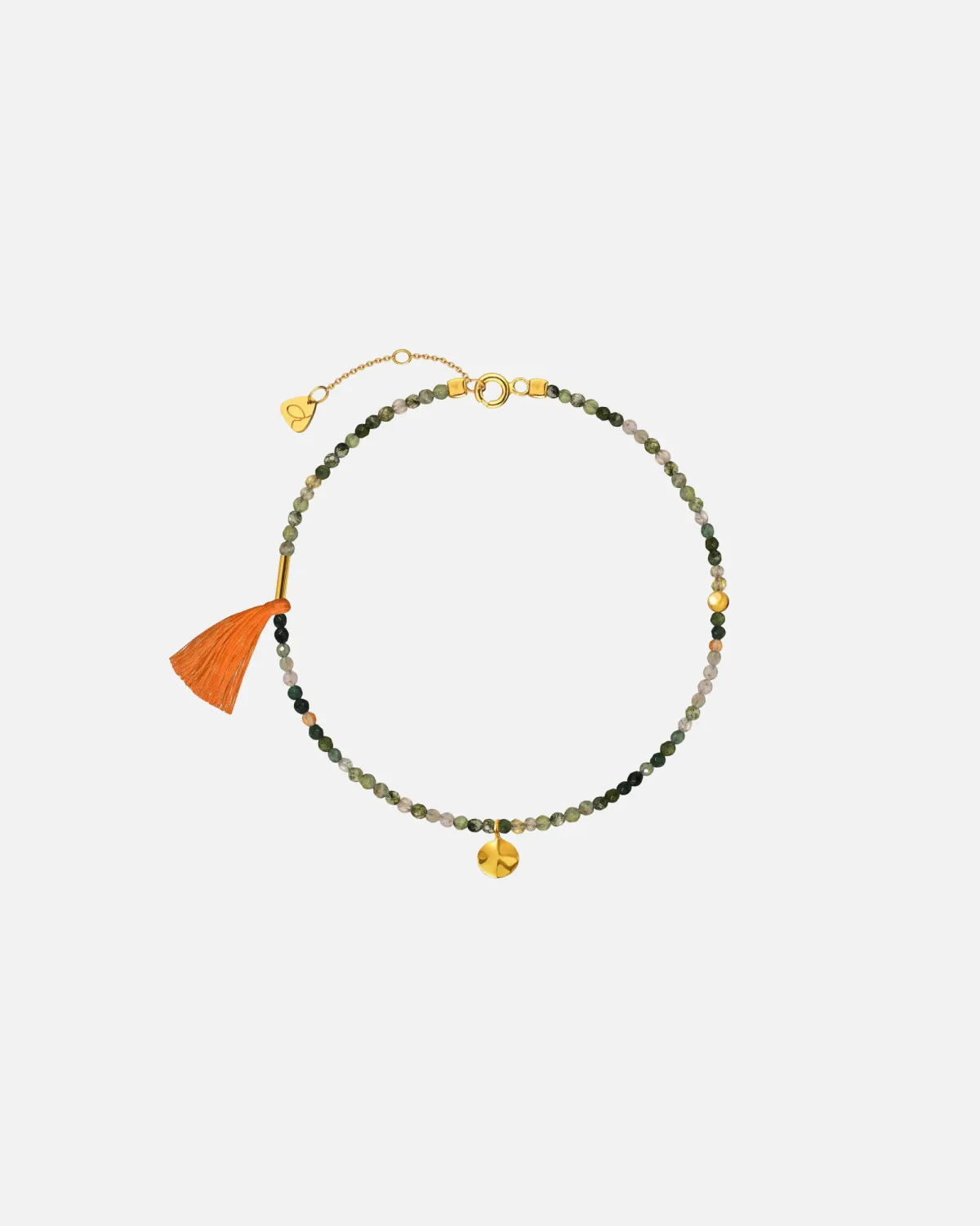 Браслет из агатов с подвеской «мятый лист» и деталями из желтого золота 585 нанизан на ювелирный тросик и застегивается замком в двух положениях – на 16, 17 и 18 сантиметров.