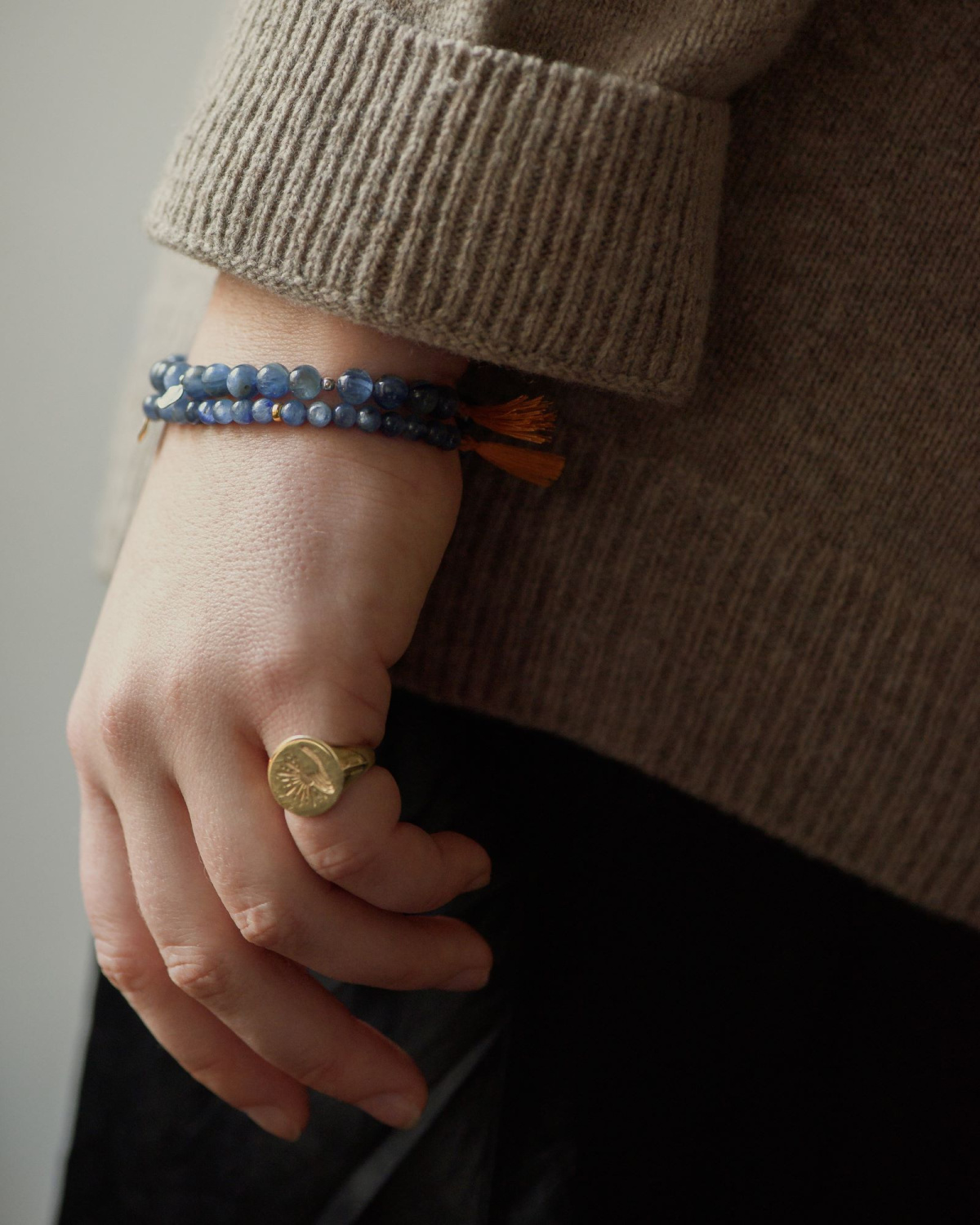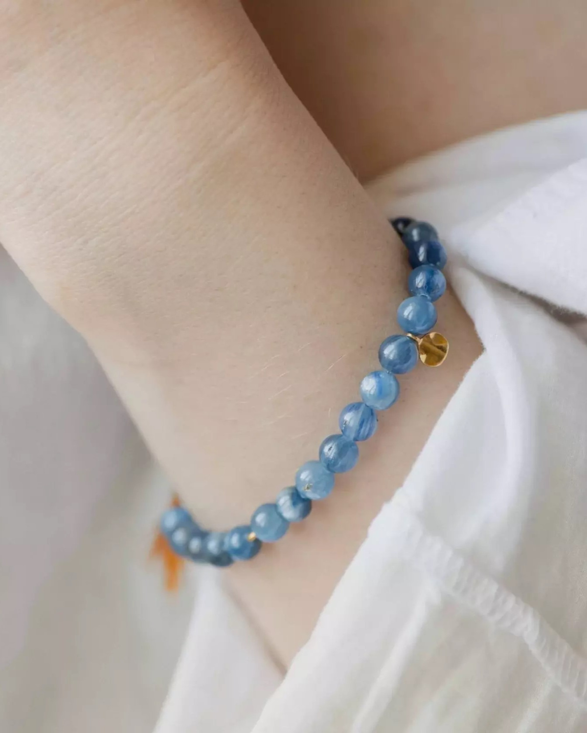 Браслет из кианита и тыквенной кисти из японской нити на суперпрочной резинке.