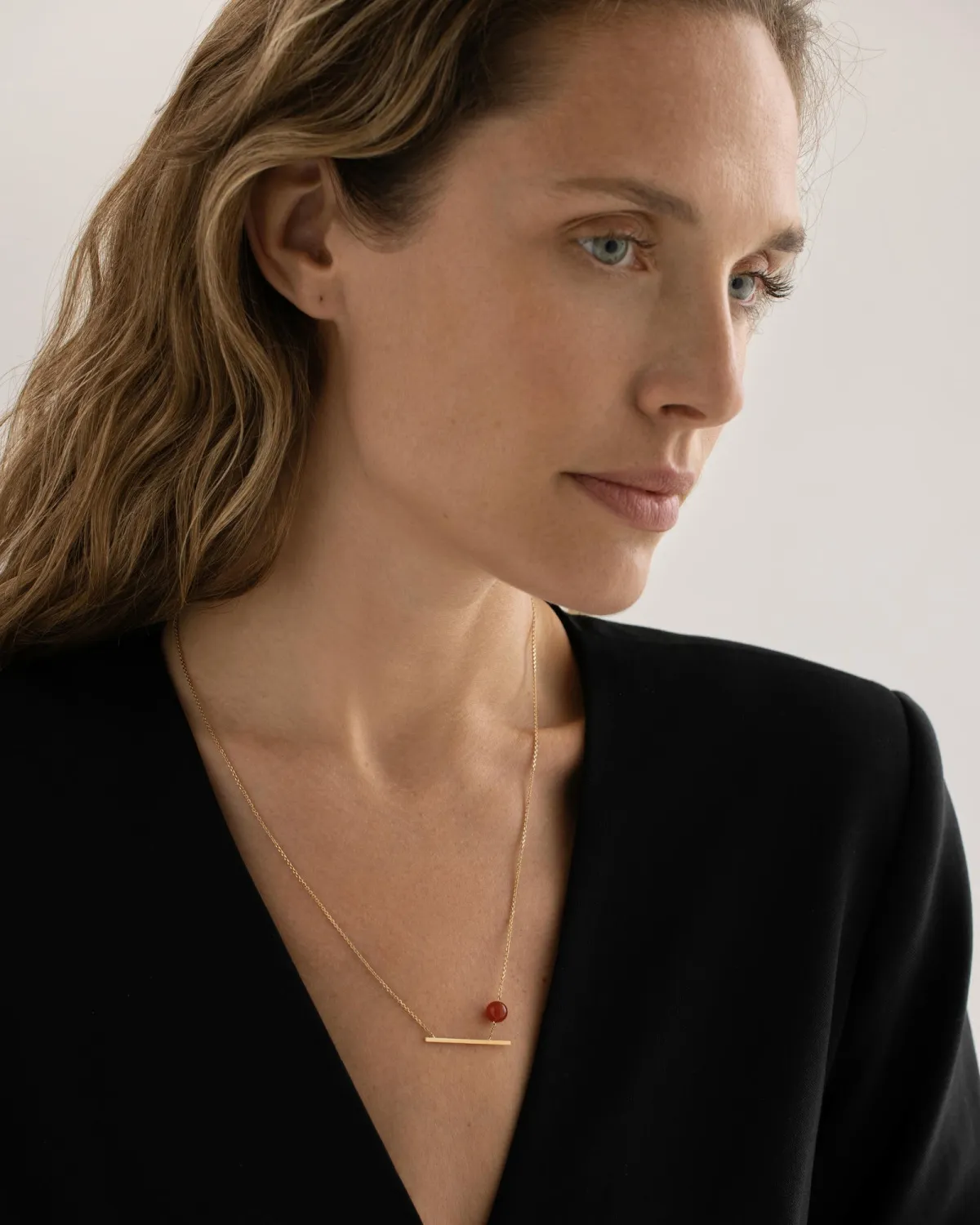 Лёгкое колье с каплей красного оникса, словно парящей на тонкой цепочке, напоминает о том, что пространство супрематического произведения не зависит ни от чего, включая силу притяжения.
