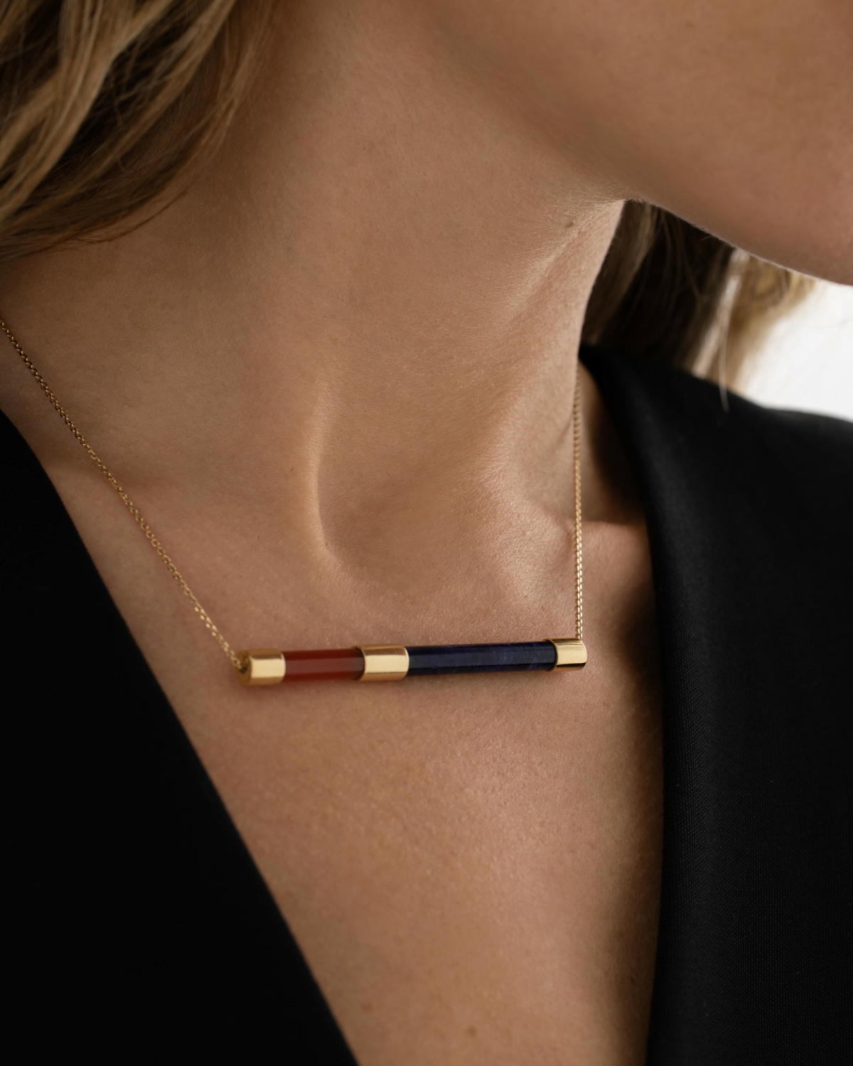 Два камня, глубокий синий содалит и сдержанный красный оникс, соединены друг с другом чашками из золота соломенного оттенка.