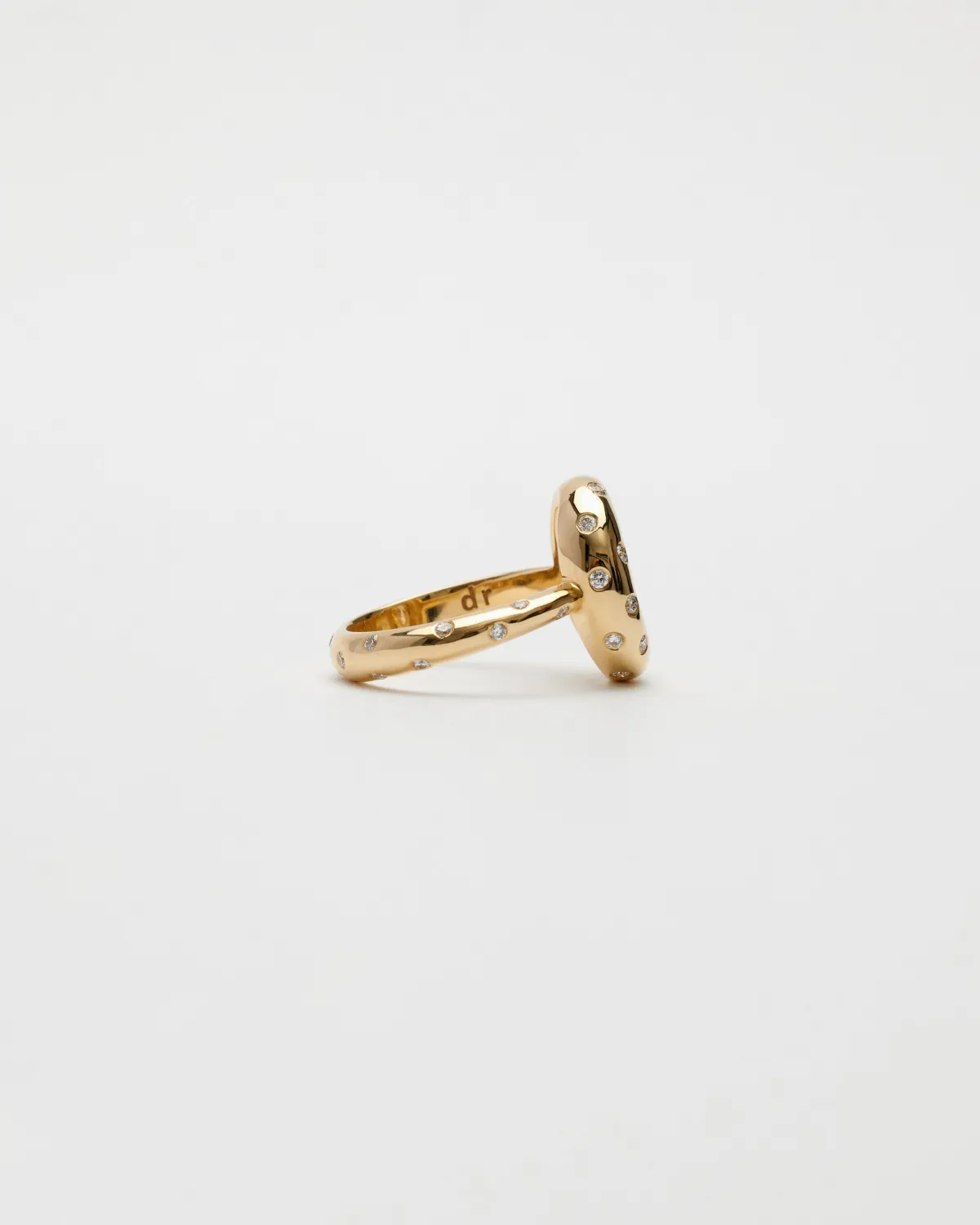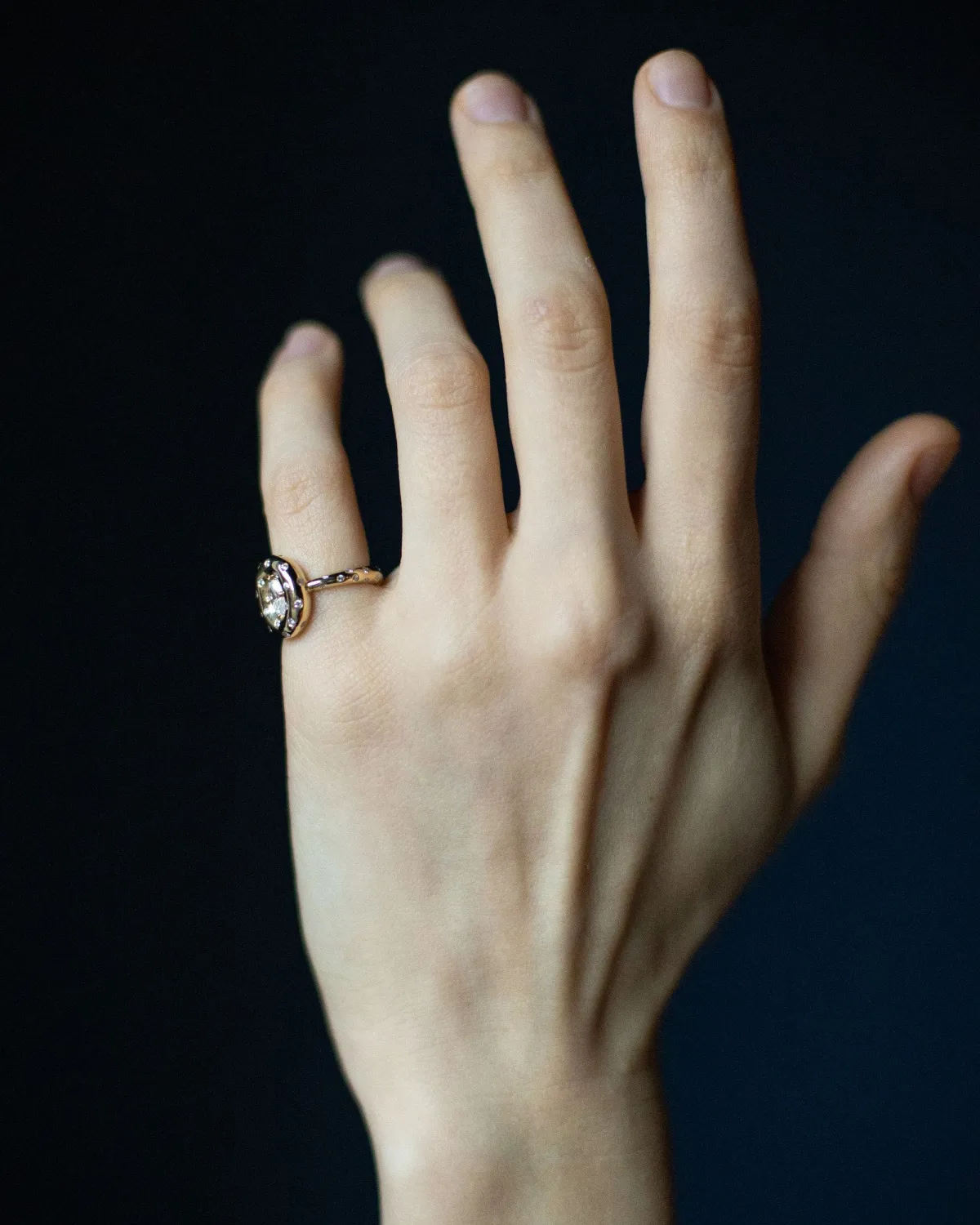 Изящное кольцо мизинчикового формата с центральным бриллиантом овальной огранки и россыпью бриллиантов, инкрустированных в шинку из лимонного золота. Изготовлено вручную.