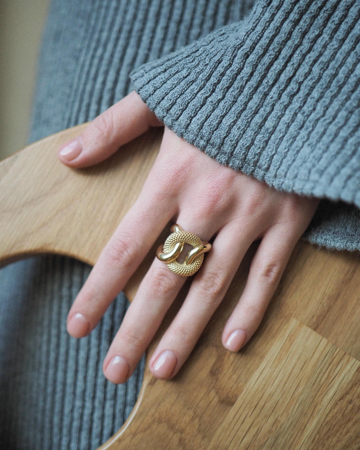 Кольцо KINK — украшение с характером, где разные текстуры и линии переплетаются, как неожиданные повороты в нашей насыщенной жизни. Его изгибы завораживают, в них хочется вглядываться — не спеша, как читаешь письмо, полное намёков, как в изгибы любимого тела, как вникать в закрученный сюжет. Это кольцо для женщины, которая не боится быть сложной, говорить прямо и держать внимание публики. Оно — не про скромность, а про силу, стиль и соблазн.