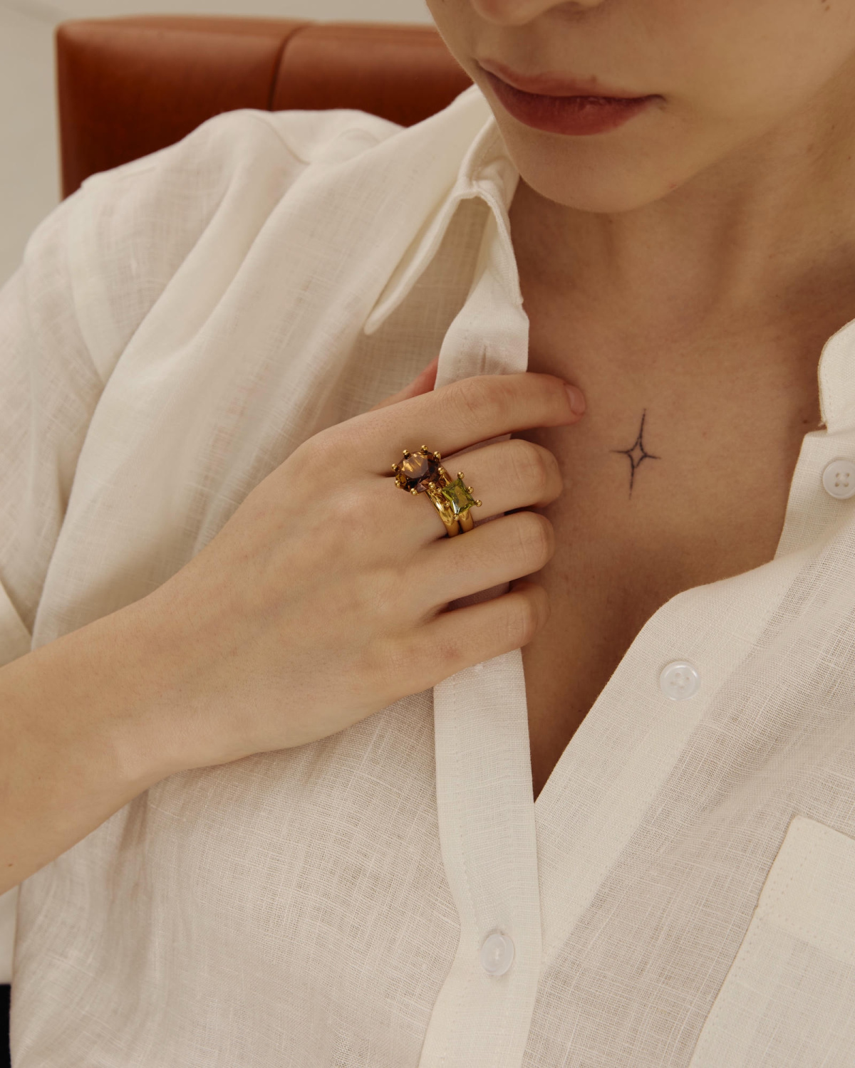 Кольцо о силе и хрупкости, первичной нежности, сильной глубине чувств. Станет вашим ярким акцентом на каждый день или для важных событий. Кольцо доступно со вставками разных цветов: белый, солнечный и зелёный фианиты, а также натуральный кварц морского цвета. Рекомендуем сочетать с кольцами «Milashka» и «Sparkle».