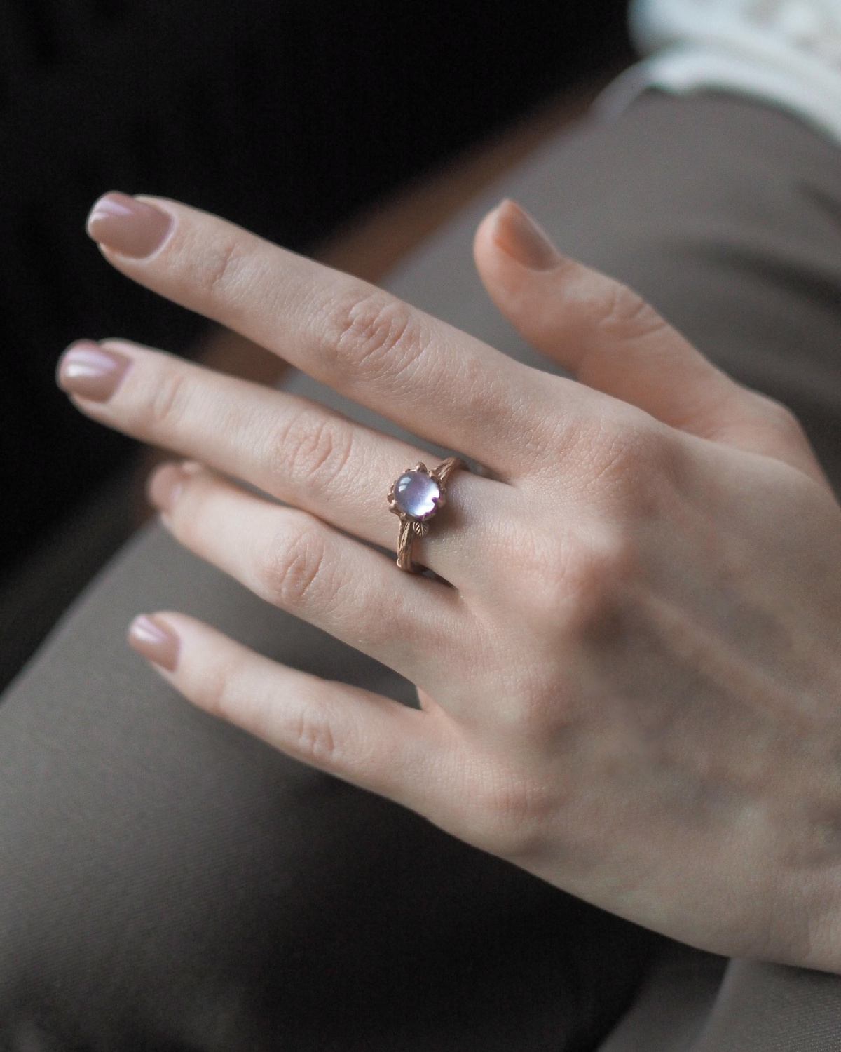 Кольцо в виде изящной веточки с листьями, которые держат камень.
