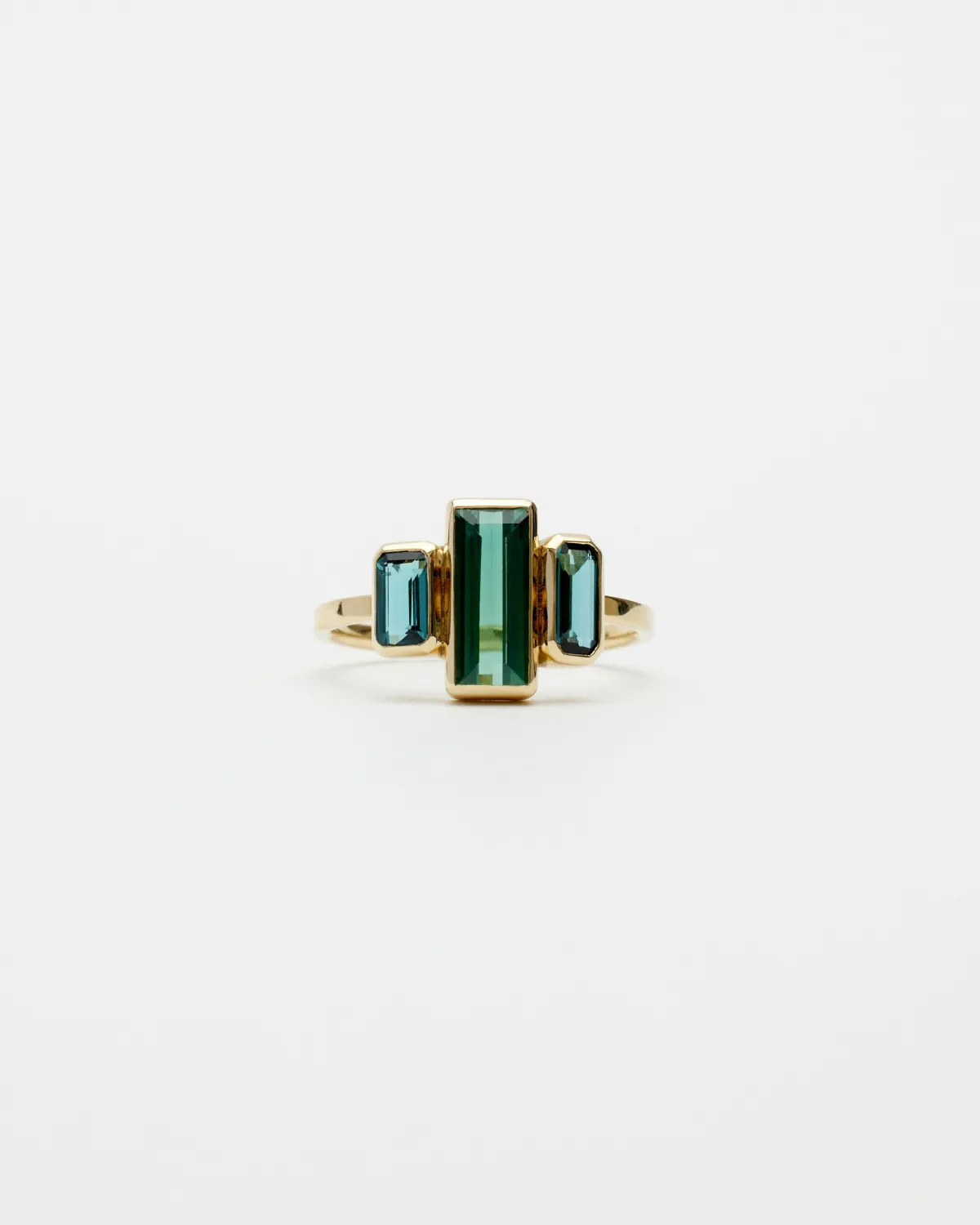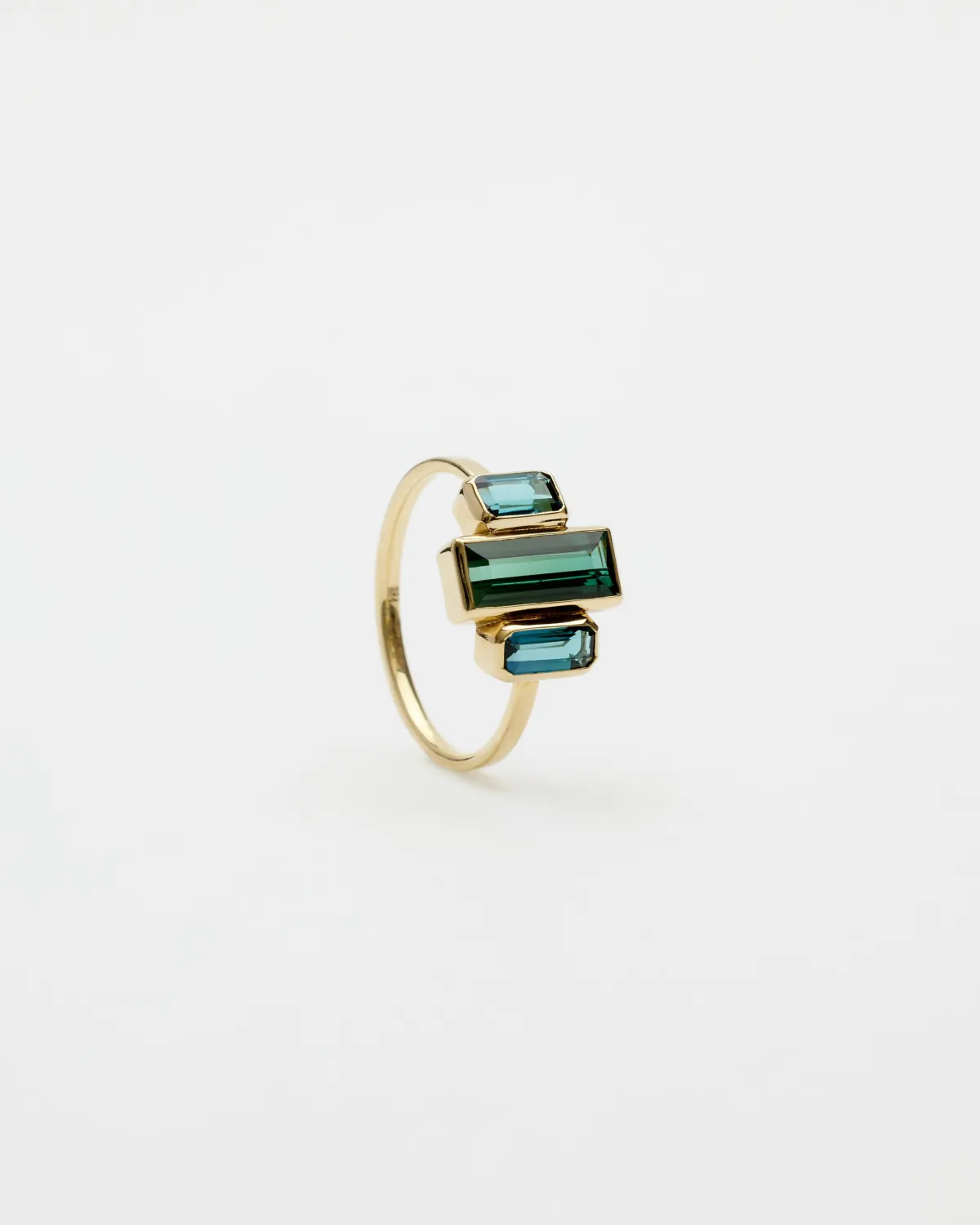 Акцентное кольцо из лимонного золота с тремя турмалинами зелёного и синих оттенков. Создано вручную в единственном экземпляре.