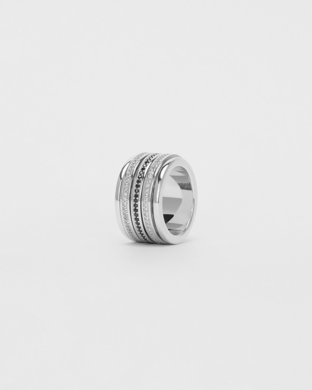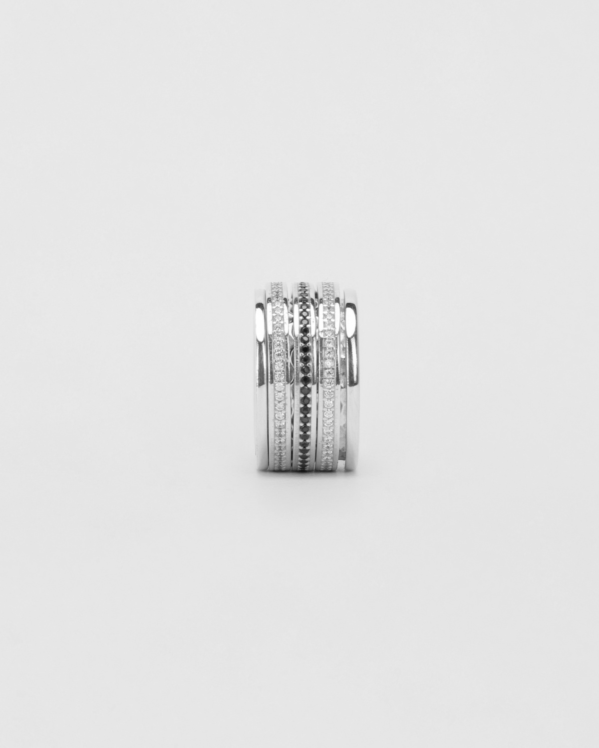 Медитативное кольцо с подвижными элементами. Основа кольца оформлена битой фактурой, которая слегка проглядывает сквозь внешние колечки. Подвижные элементы с дорожками графичных камней будут классным мелодичным акцентом в вашем сете. Динамичное кольцо — неоспоримый помощник в верном движении вперёд.