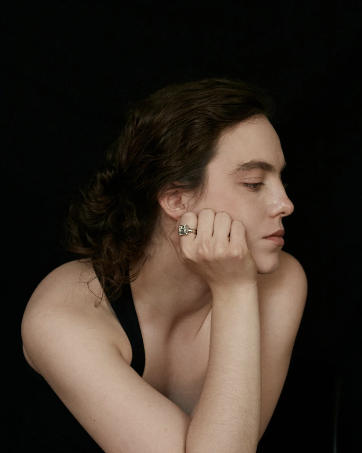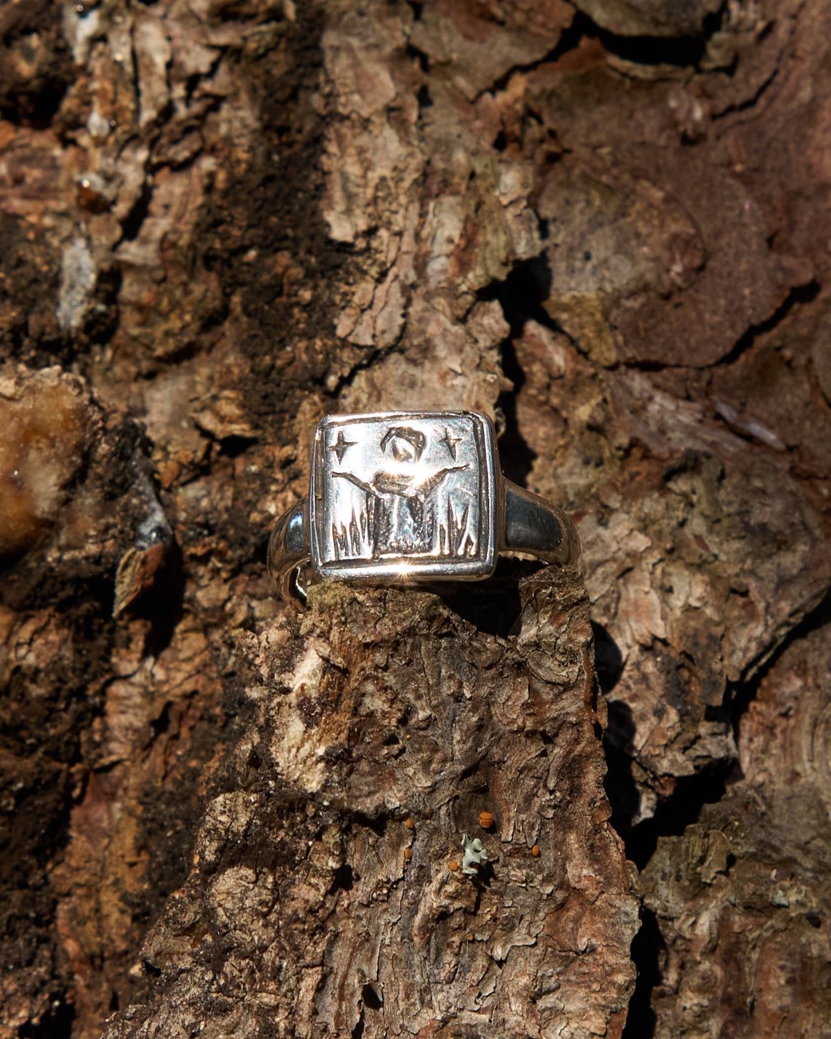 Кольцо Oranta, отсылающее к ранней Византийской традиции изображения Девы Марии с двумя четырехконечными звездами в ладонях. Штихельная резьба внутри кольца и выступы на обратной стороне кольца стилистически отсылают к декоративным техникам древних украшений.