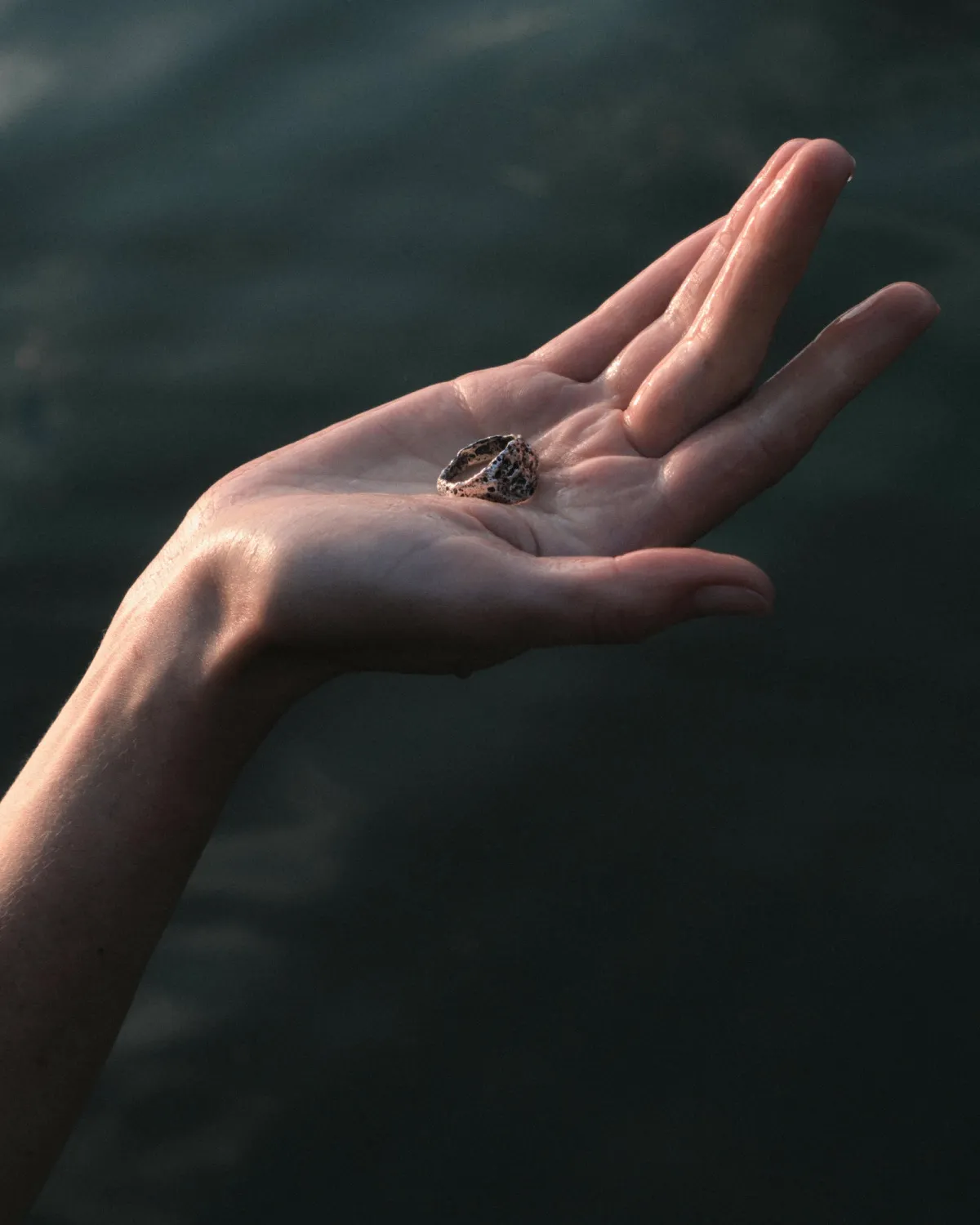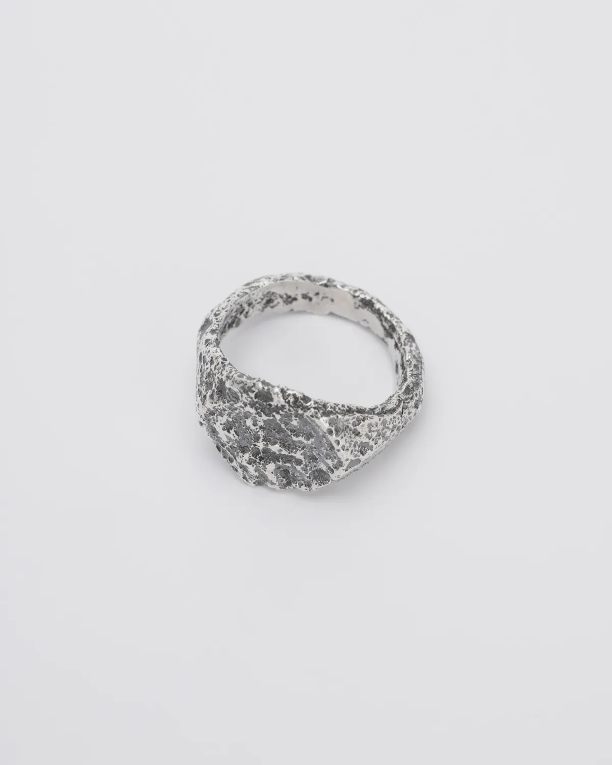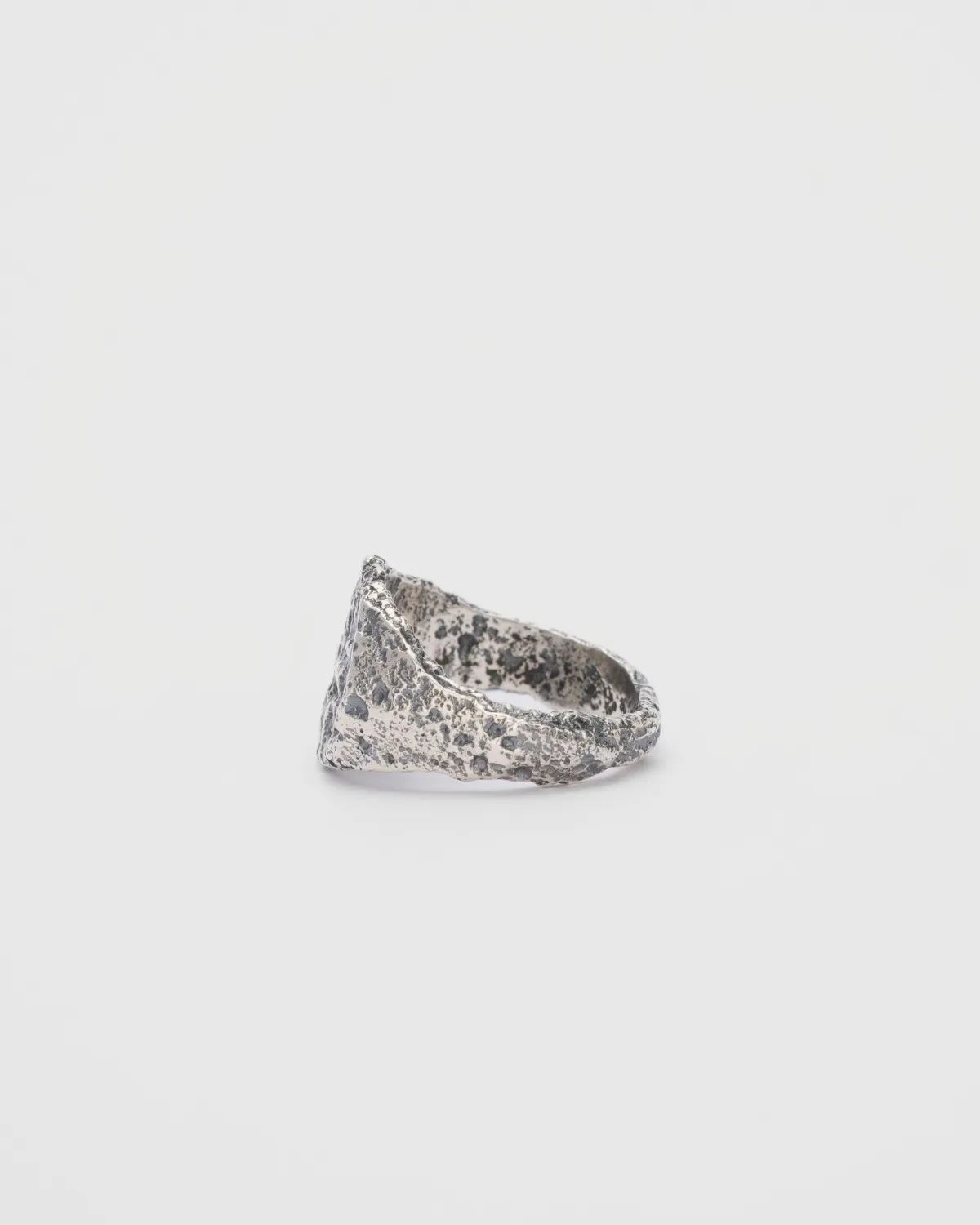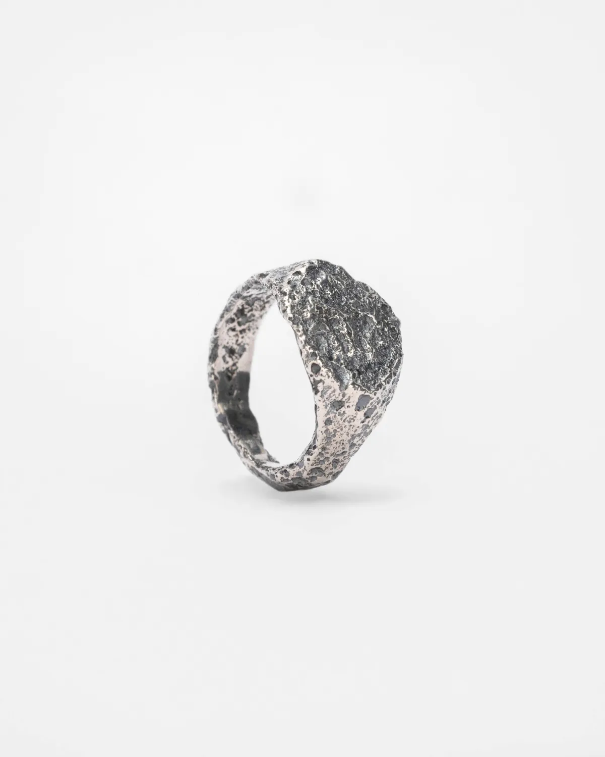 Форма этого кольца снята с печатки XV века, найденной в Новгороде. Фактура и кратеры в металле образовались по всему кольцу, а на месте геральдического символа остался лишь намек на него.
