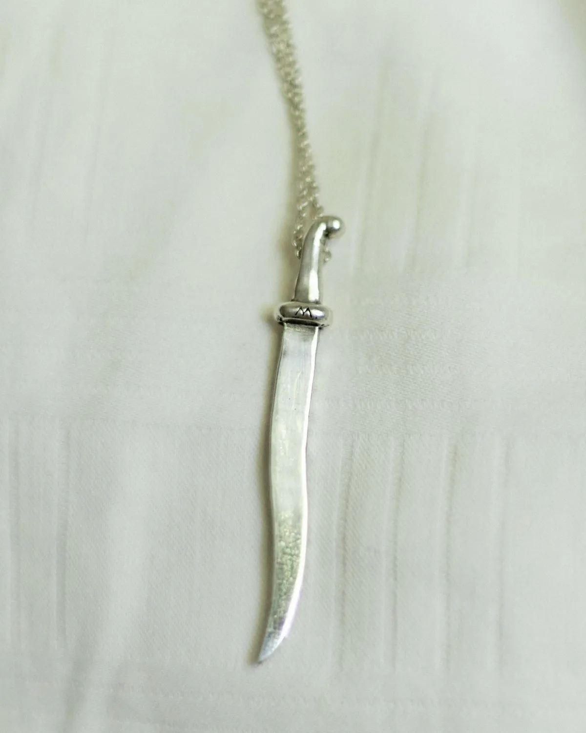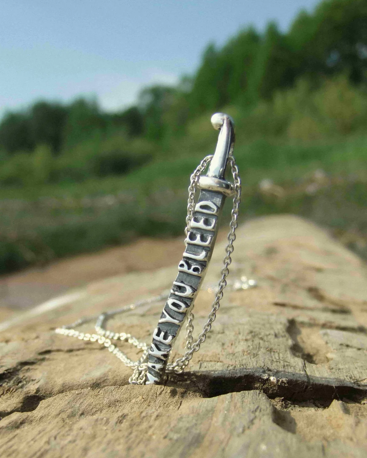 Подвеска в виде восточного кинжала с надписью make you bleed. Как напоминание себе о том, что добро тоже может быть с зубами, а испытывать злость — нормально.