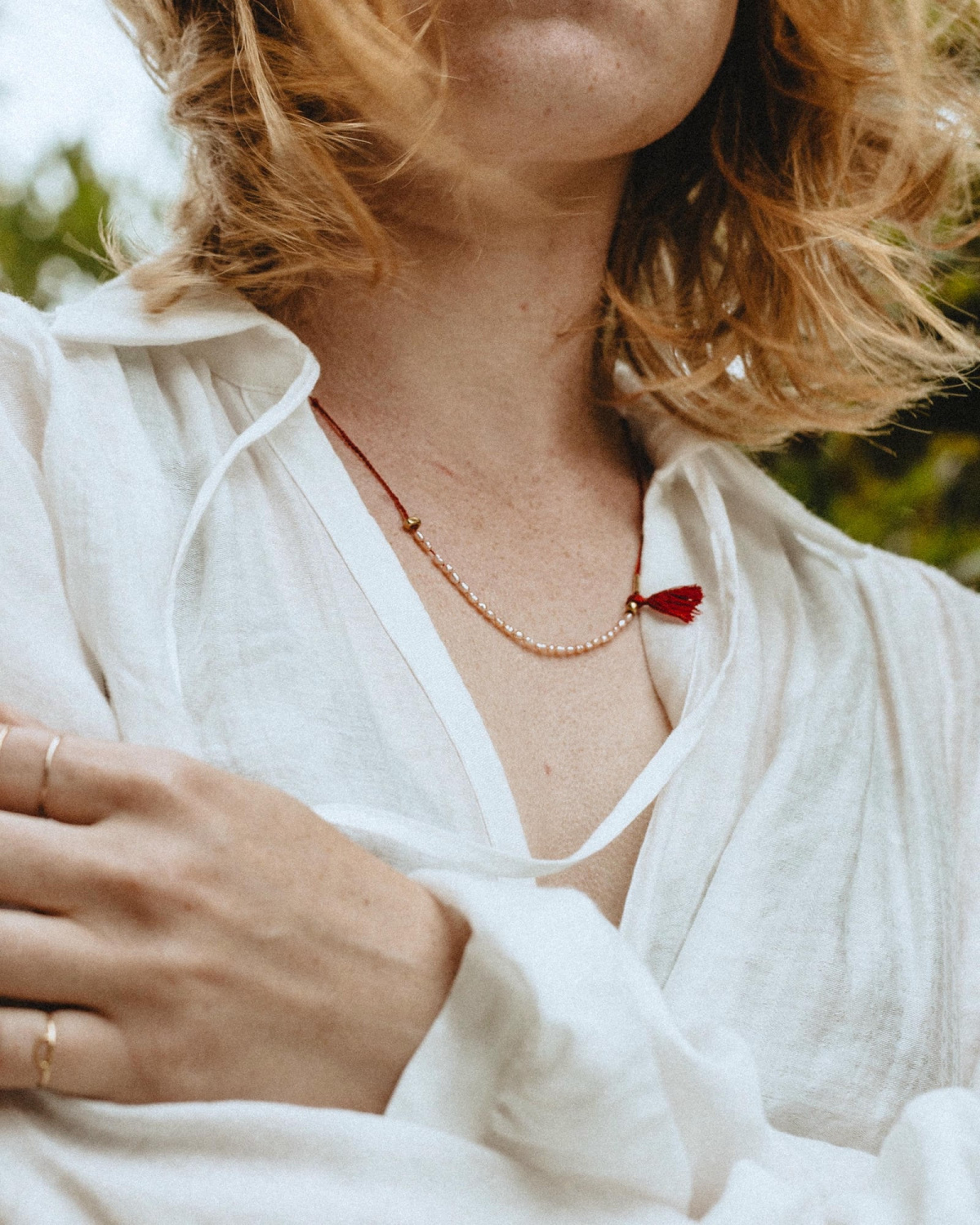 Подвеска из красной нити с розовым жемчугом