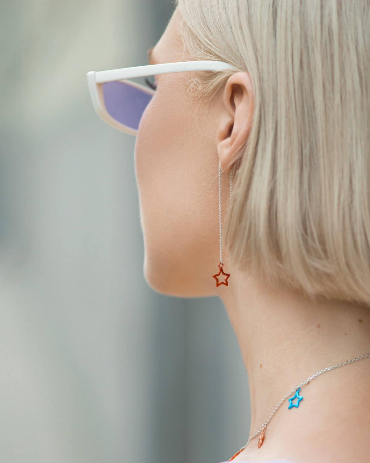Серьги протяжки из цепочки с алмазной гранью, длинной - 12 см. с ассиметричными подвесами, покрытыми нанокерамикой разных цветов.