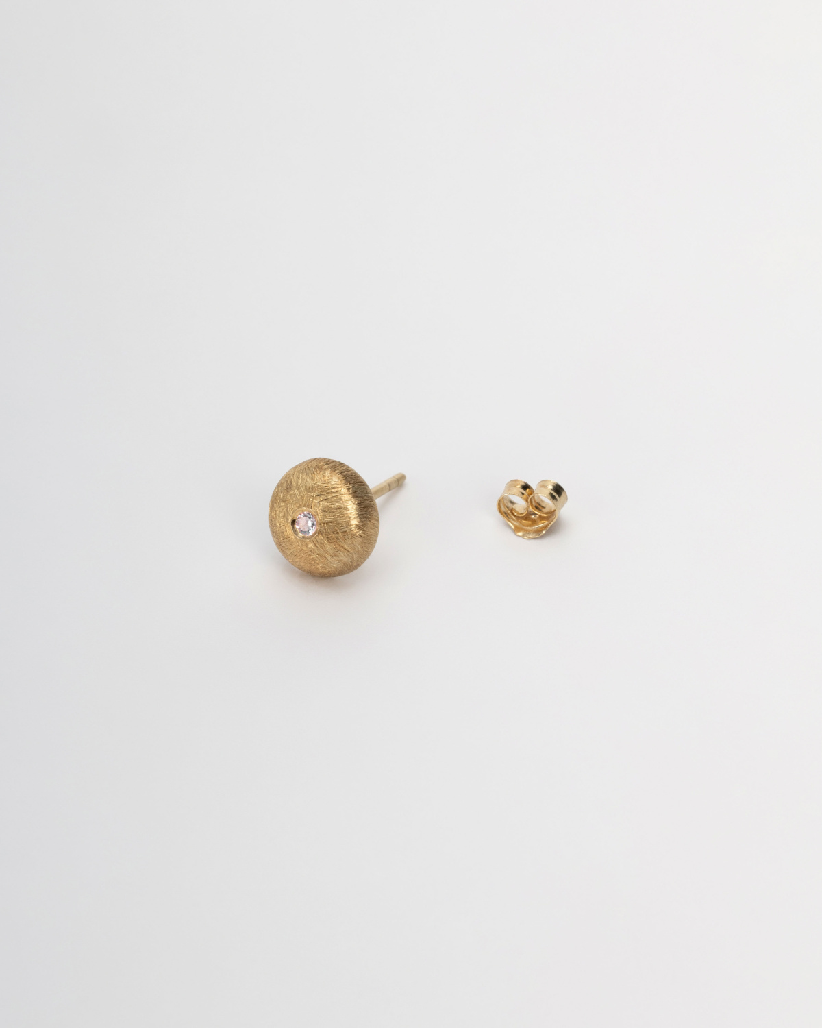 Фактурные серьги с фианитом в золотом сатинированном куполе. Украшение с мягкой геометрией и ощущением тепла на каждый день. Тип застёжки — гвоздик.